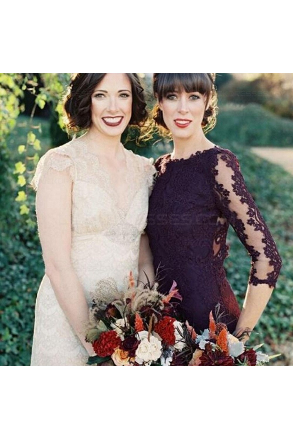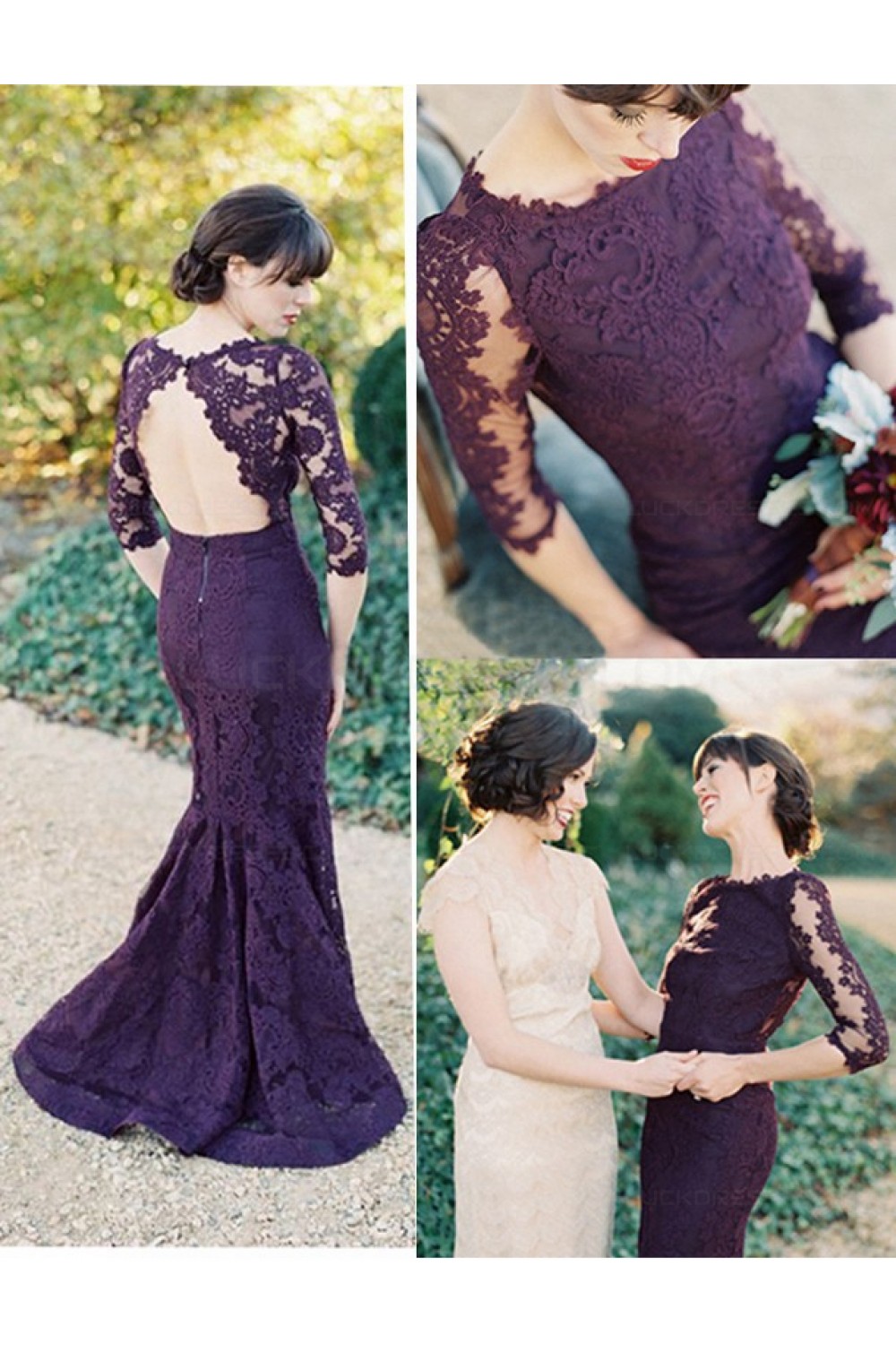 3/4 Length Sleeves Mermaid Long Purple Lace Prom Dresses Party Evening Gowns 3020464