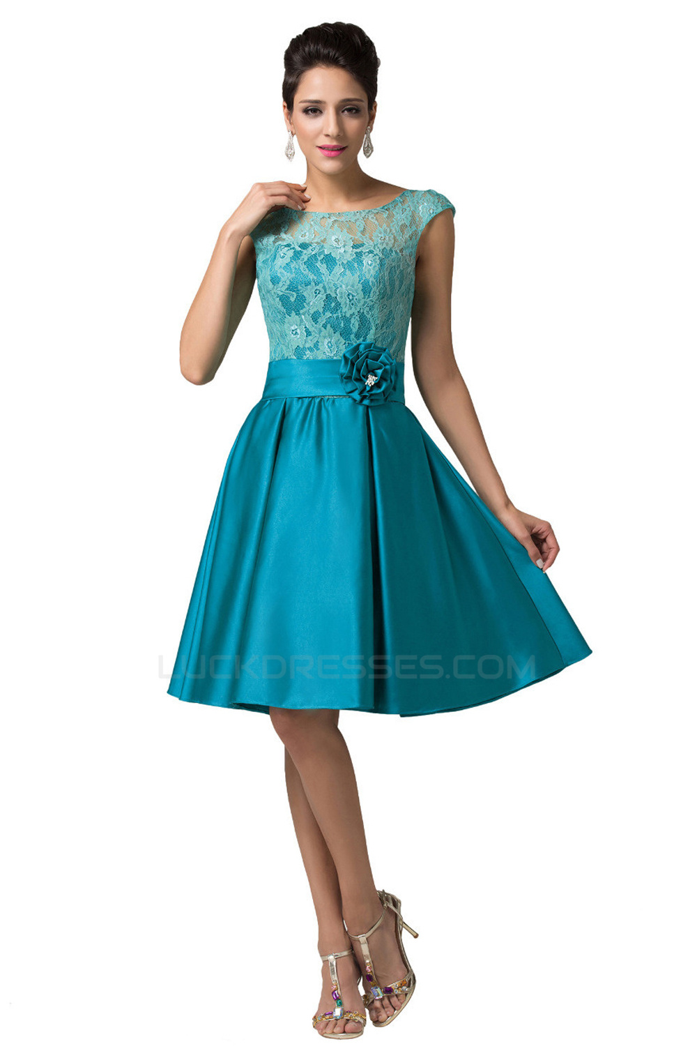A-Line Bateau Lace and Satin Short Prom Evening Formal Bridesmaid Dresses ED011657