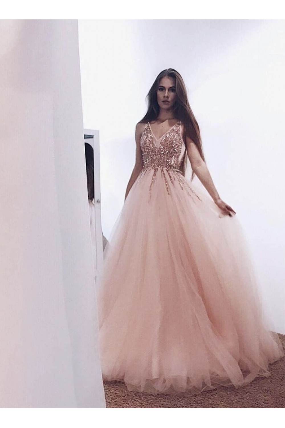 A-Line Beaded Tulle Long Prom Dresses Formal Evening Gowns 6011010
