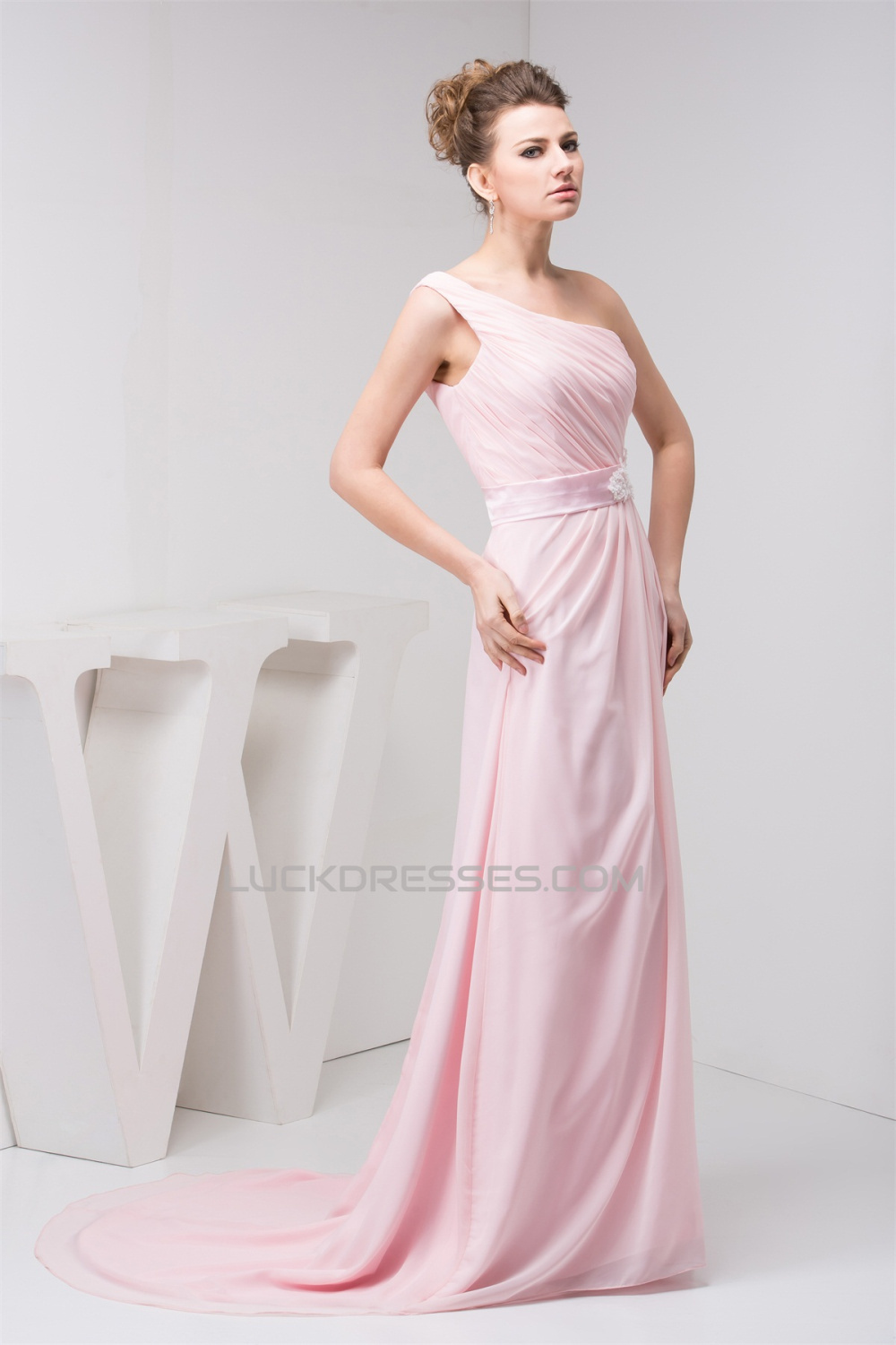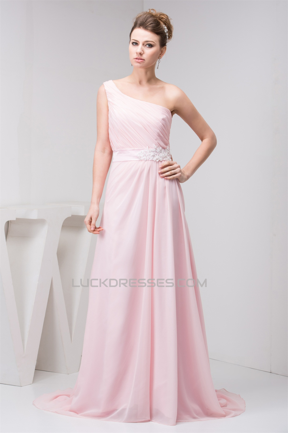 -60% A-Line Beading Brush Sweep Train One-Shoulder Long Pink Chiffon Bridesmaid Dresses 02010089