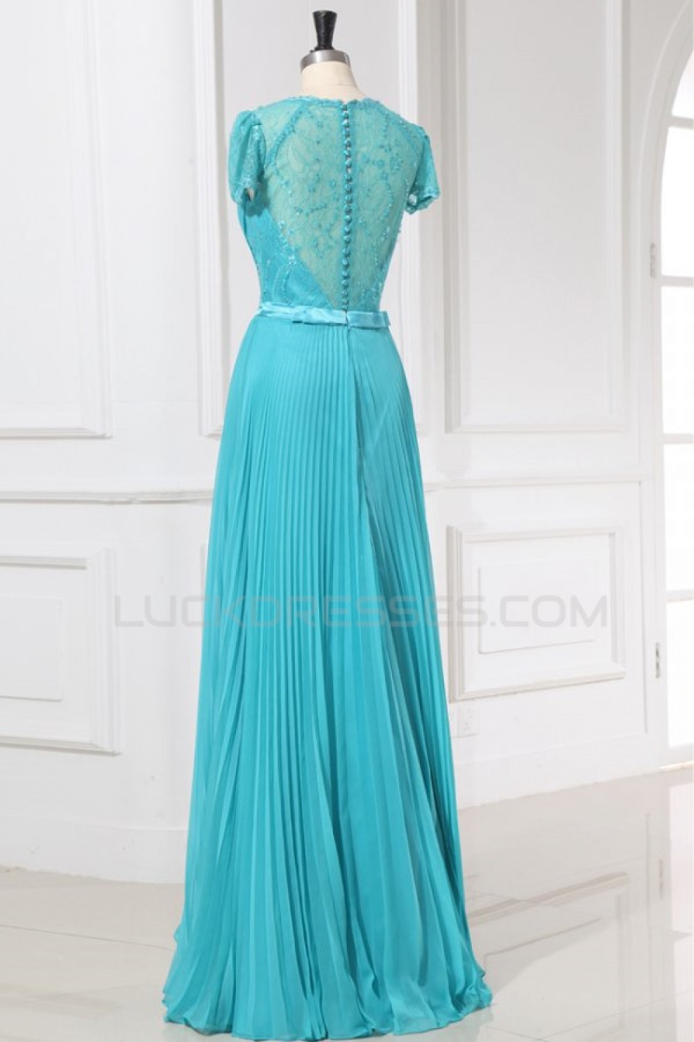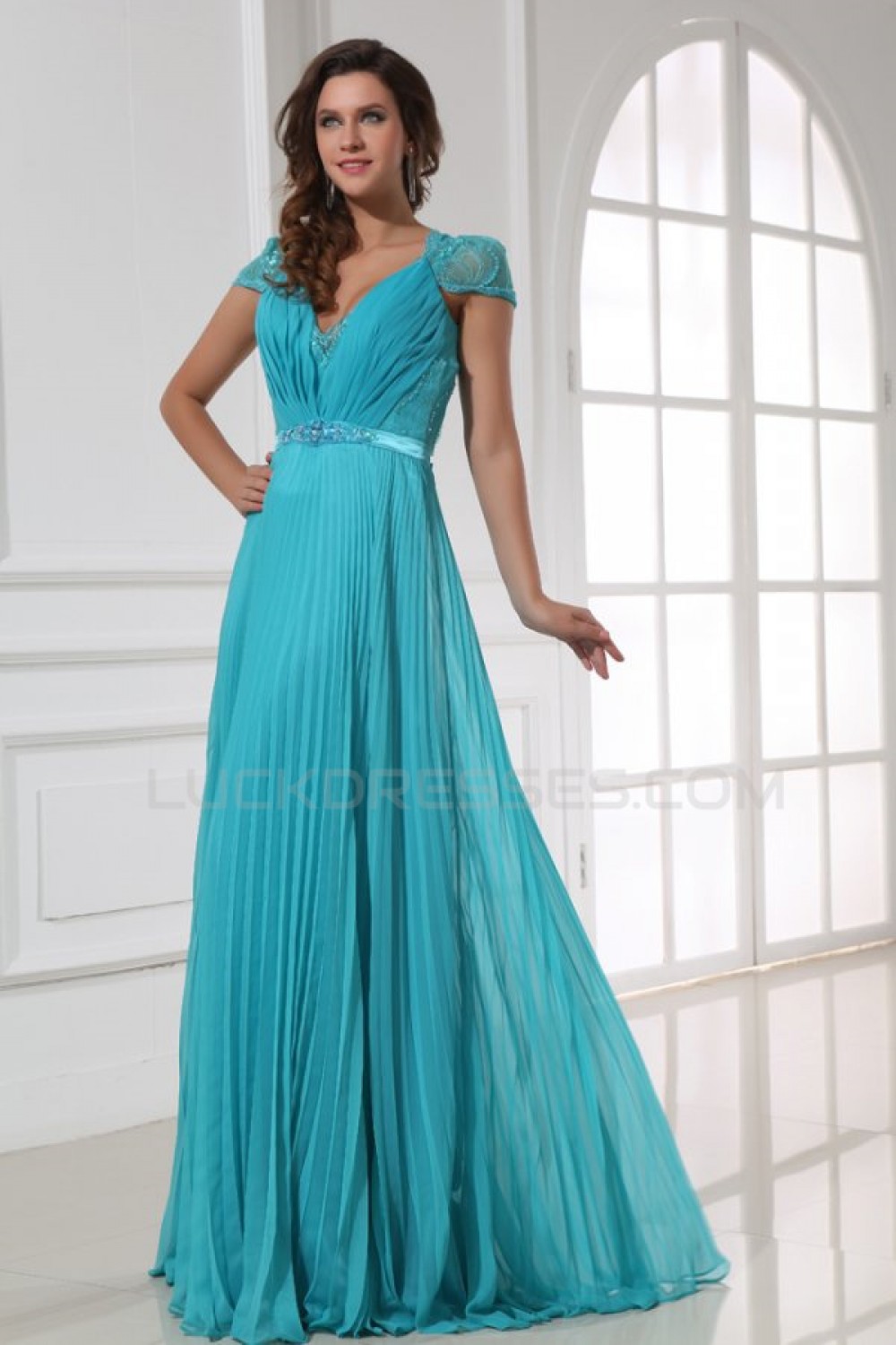 A-Line Cap Sleeve Pleated Long Blue Chiffon and Lace Prom Evening Formal Party Dresses ED010204