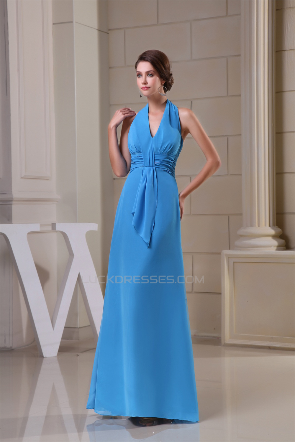A-Line Floor-Length Ruched Halter Sleeveless Long Blue Party Formal Bridesmaid Dresses 02020019