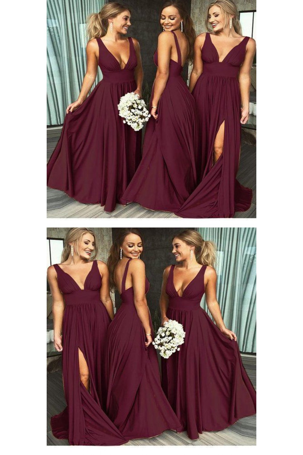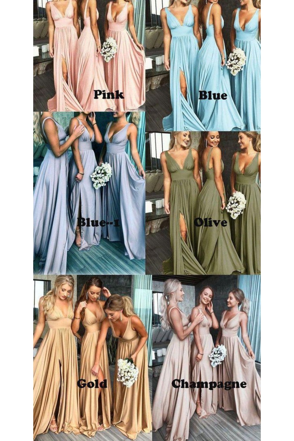 A-Line Floor Length V-Neck Long Blue Bridesmaid Dresses with Slit 3010281