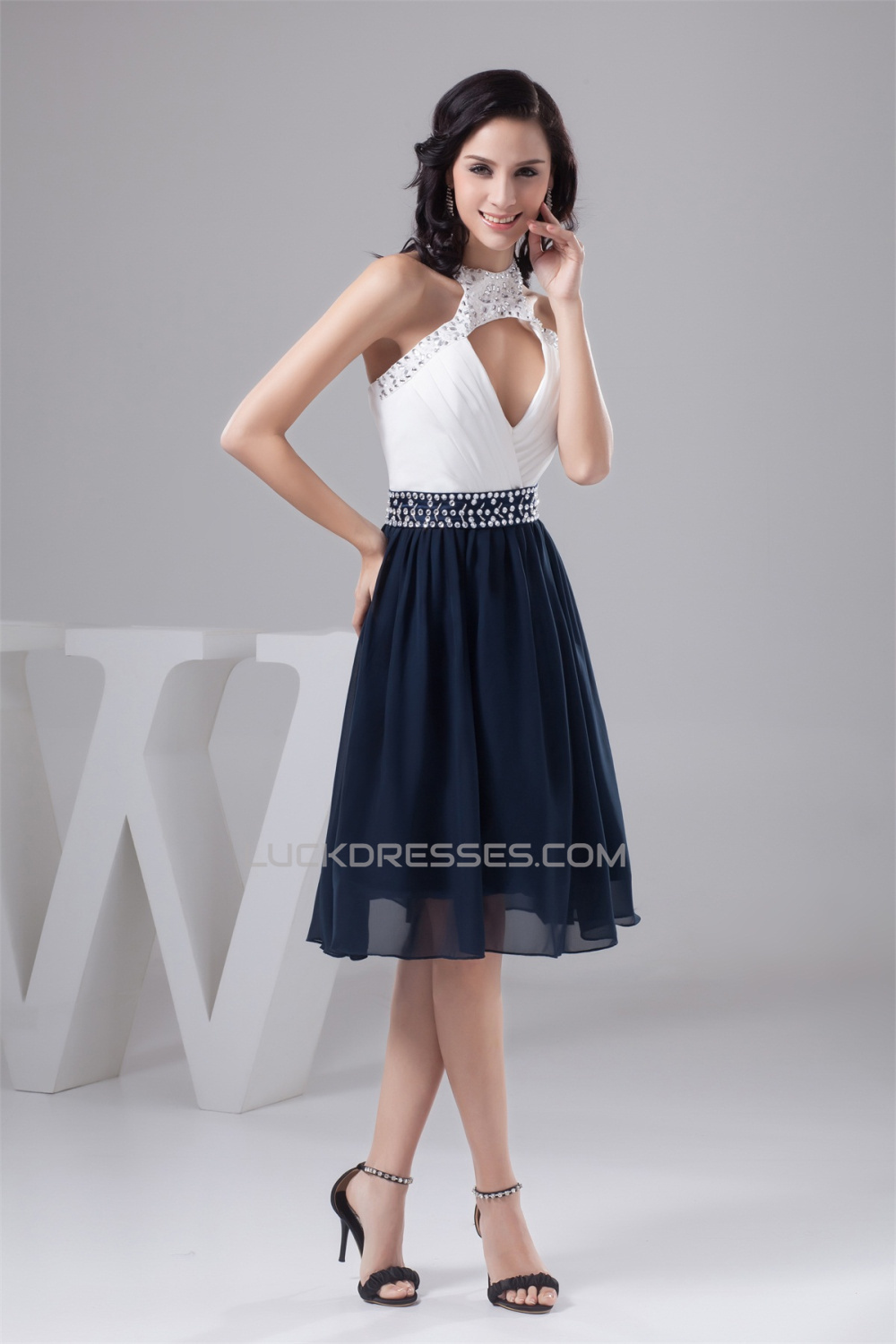 A-Line Halter Beading Sleeveless Knee-Length White Blue Prom/Formal Evening Dresses 02021302