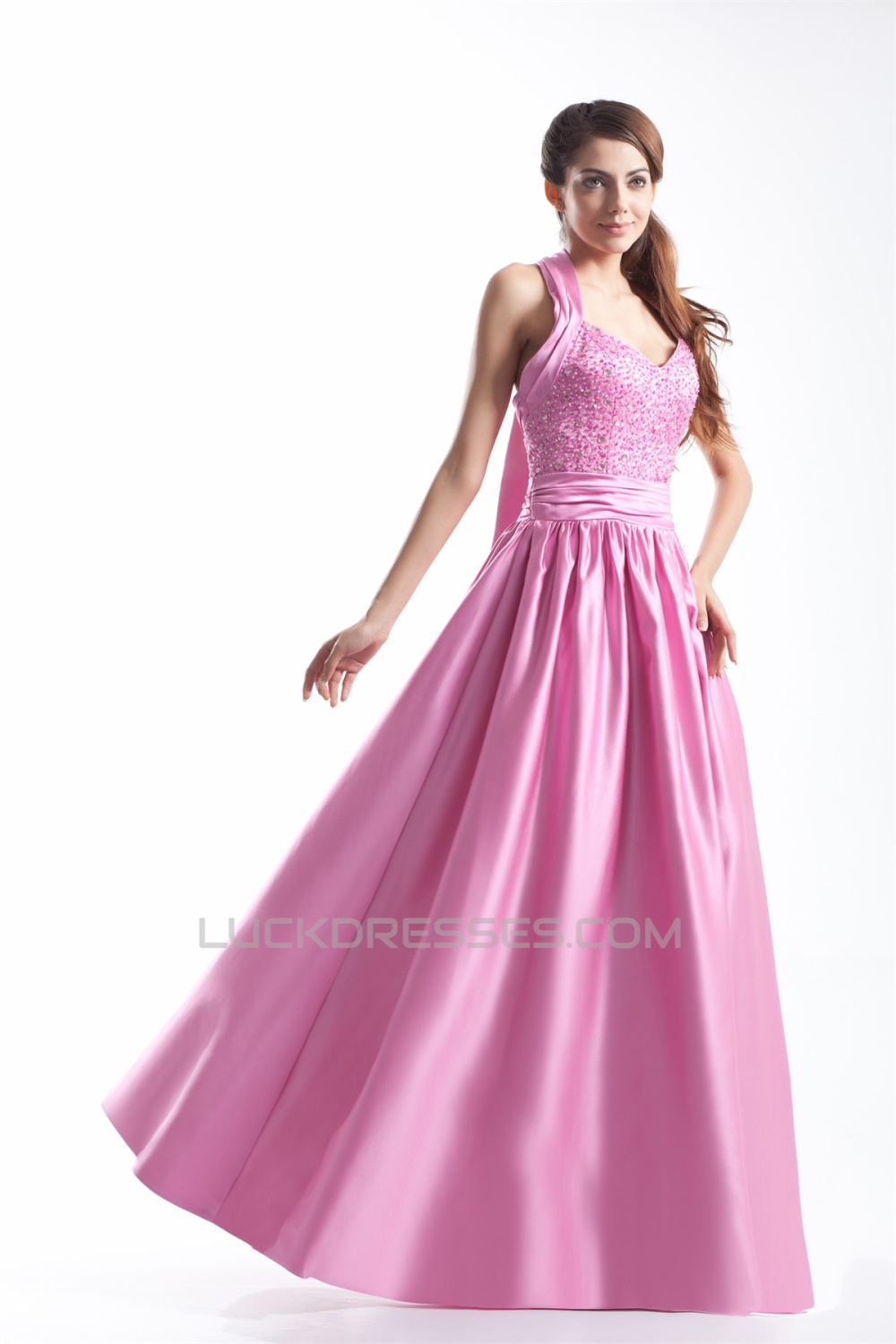 -60% A-Line Halter Floor-Length Beading Satin Prom/Formal Evening Dresses 02020765