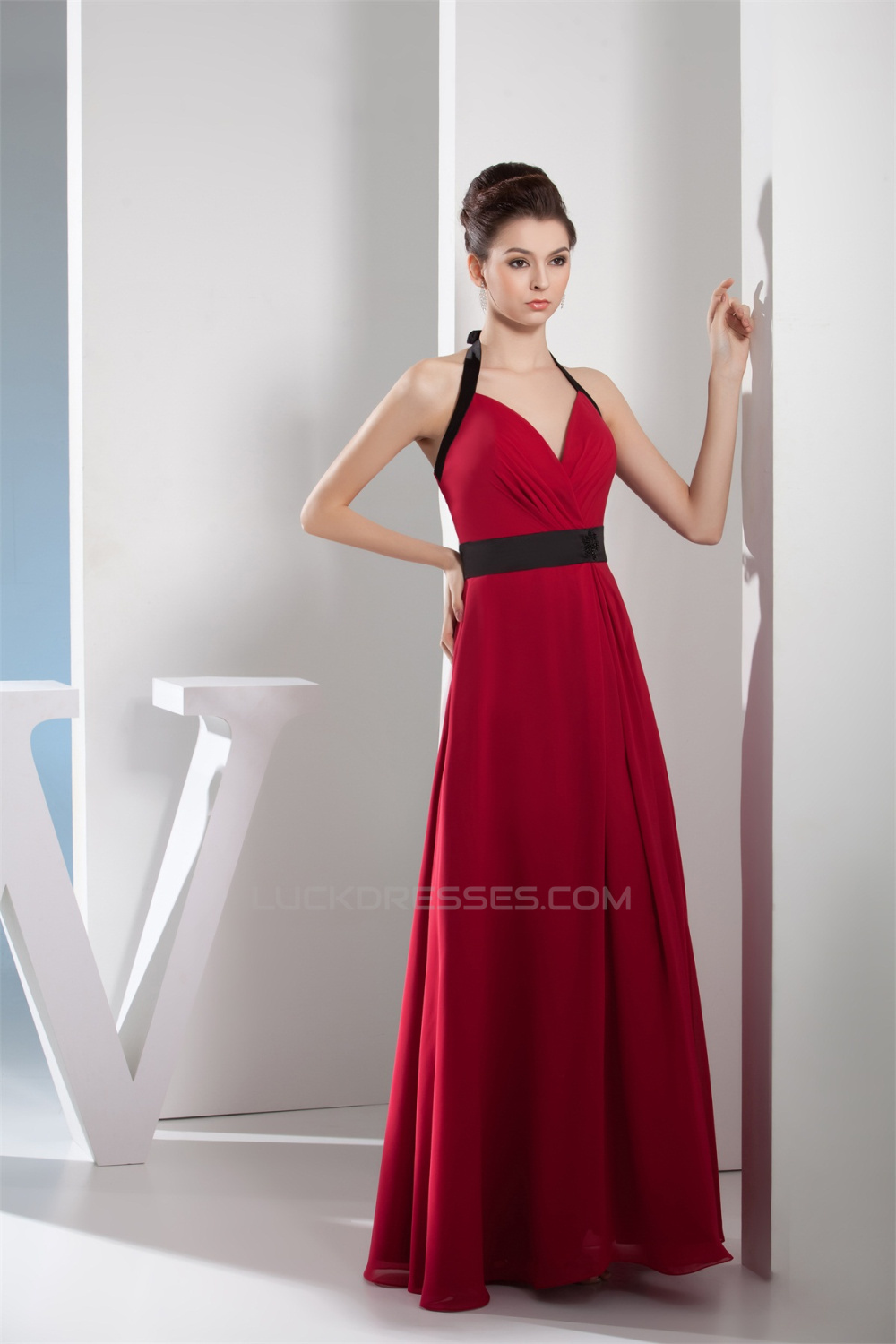 A-Line Halter Long Chiffon Red Bridesmaid Dresses 02010002
