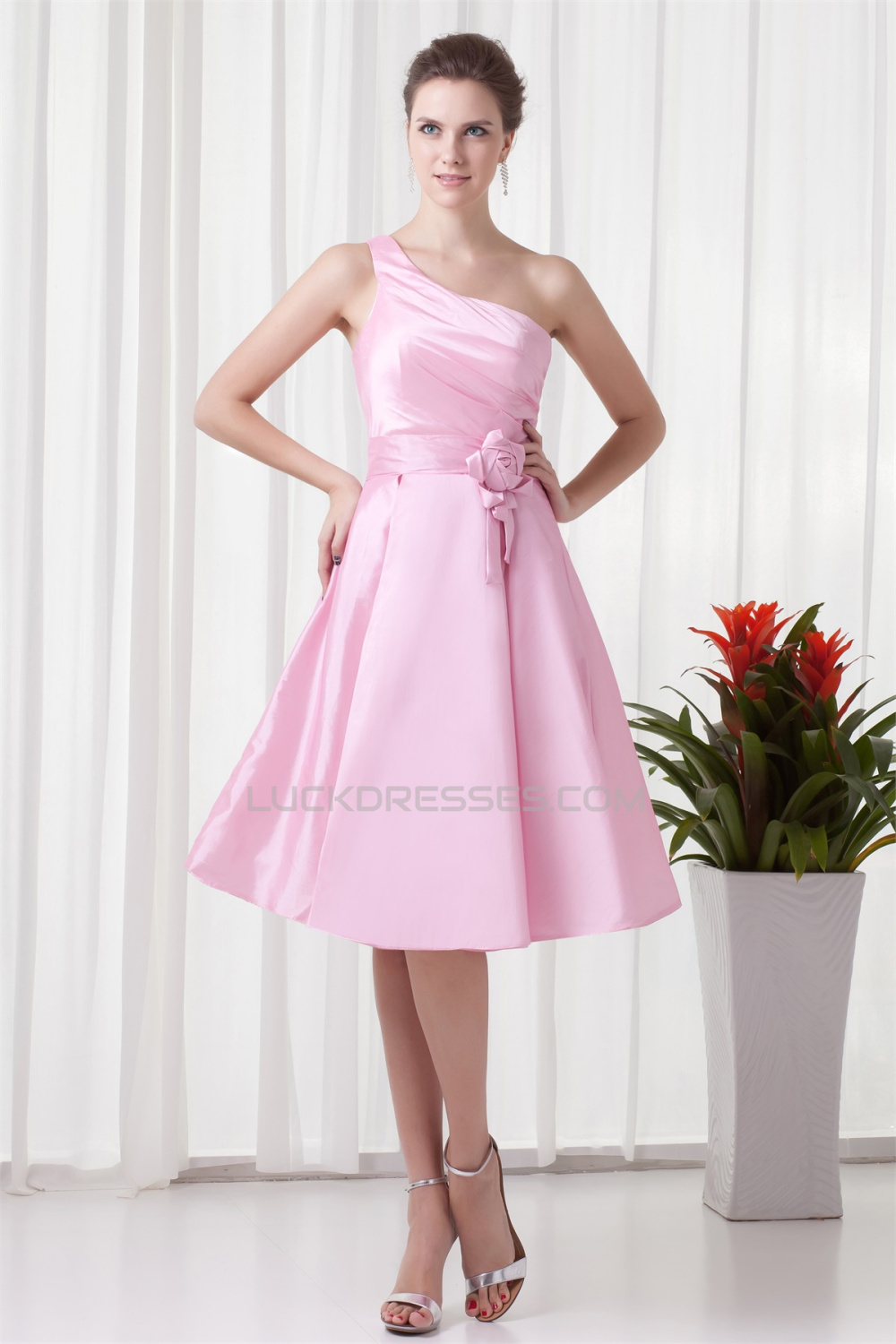 A-Line Handmade Flowers One-Shoulder Short Pink Bridesmaid Dresses 02010483