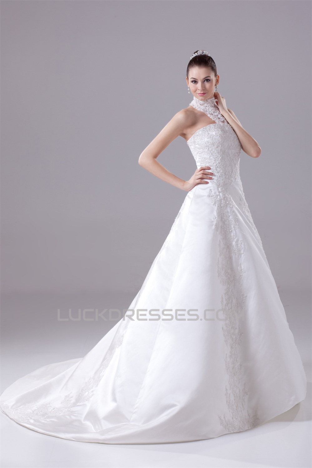 -50% A-Line High-Neck Satin Lace Wedding Dresses 2030175