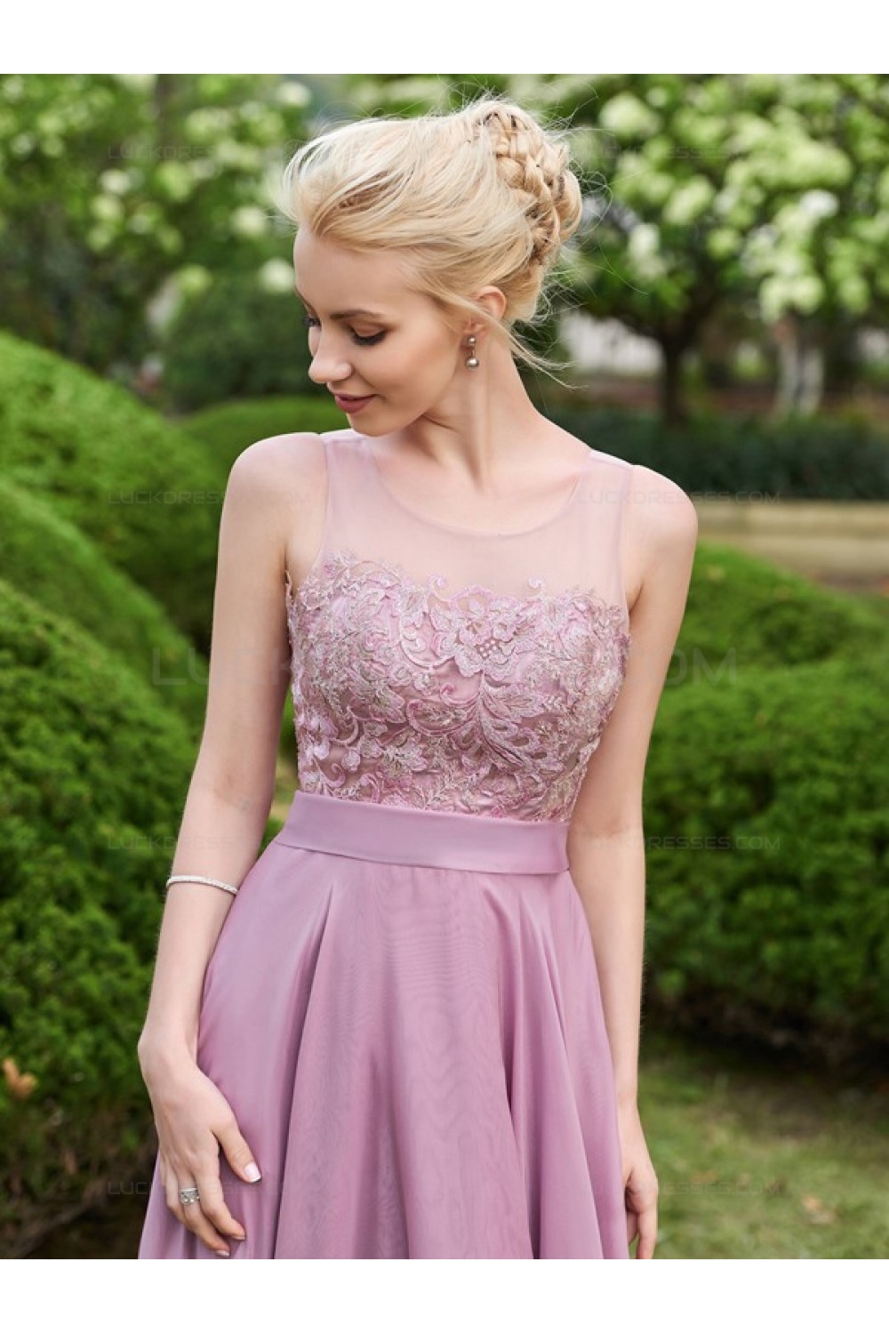 -47% A-Line Lace Chiffon Illusion Neckline Short Wedding Guest Dresses Bridesmaid Dresses 3010220