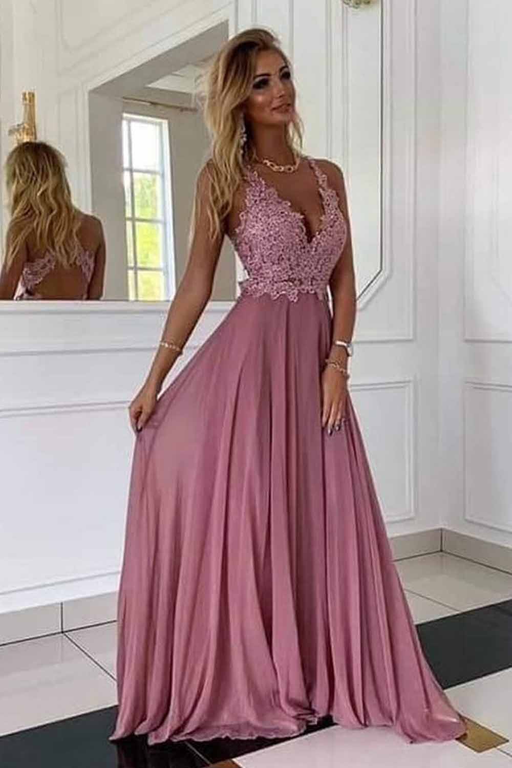 A-Line Lace Chiffon V-Neck Long Prom Dresses Formal Evening Gowns 6011041