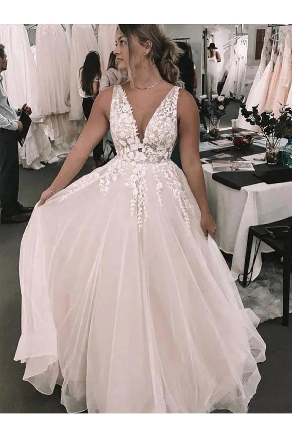 A-Line Lace V Neck Wedding Dresses Bridal Gowns 903216