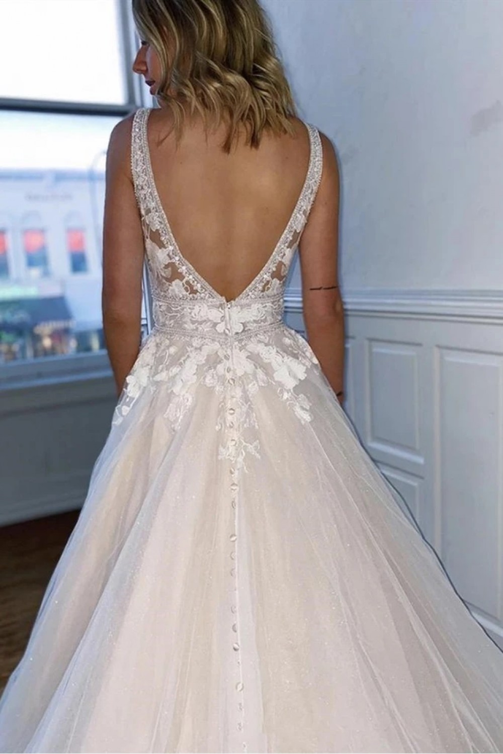 A-Line Lace and Tulle V Neck Wedding Dresses Bridal Gowns 903391