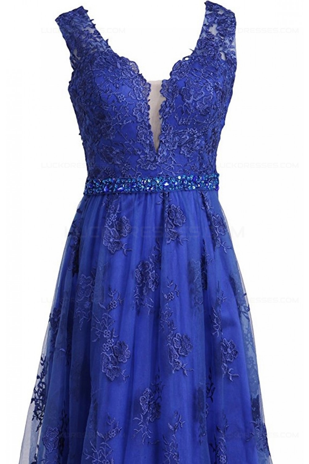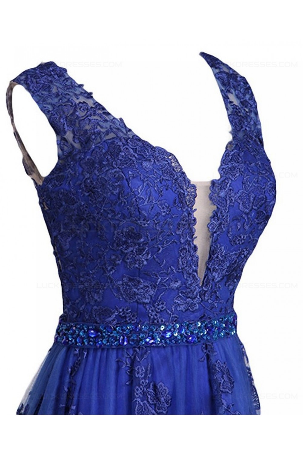 A-Line Long Blue Beaded Lace Prom Dresses Party Evening Gowns 3020372
