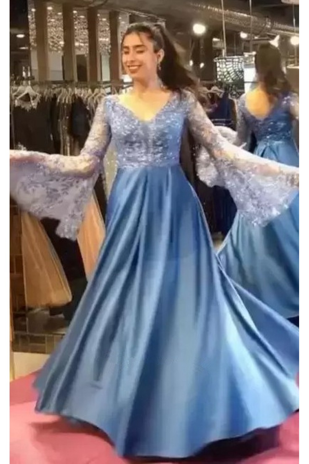 A-Line Long Blue Lace Mother of the Bride Dresses with Sleeves 702099