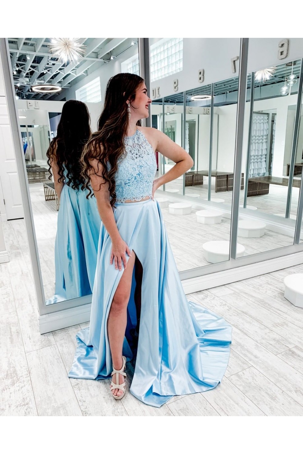 A-Line Long Blue Lace Two Pieces Prom Dress Formal Evening Gowns 901145