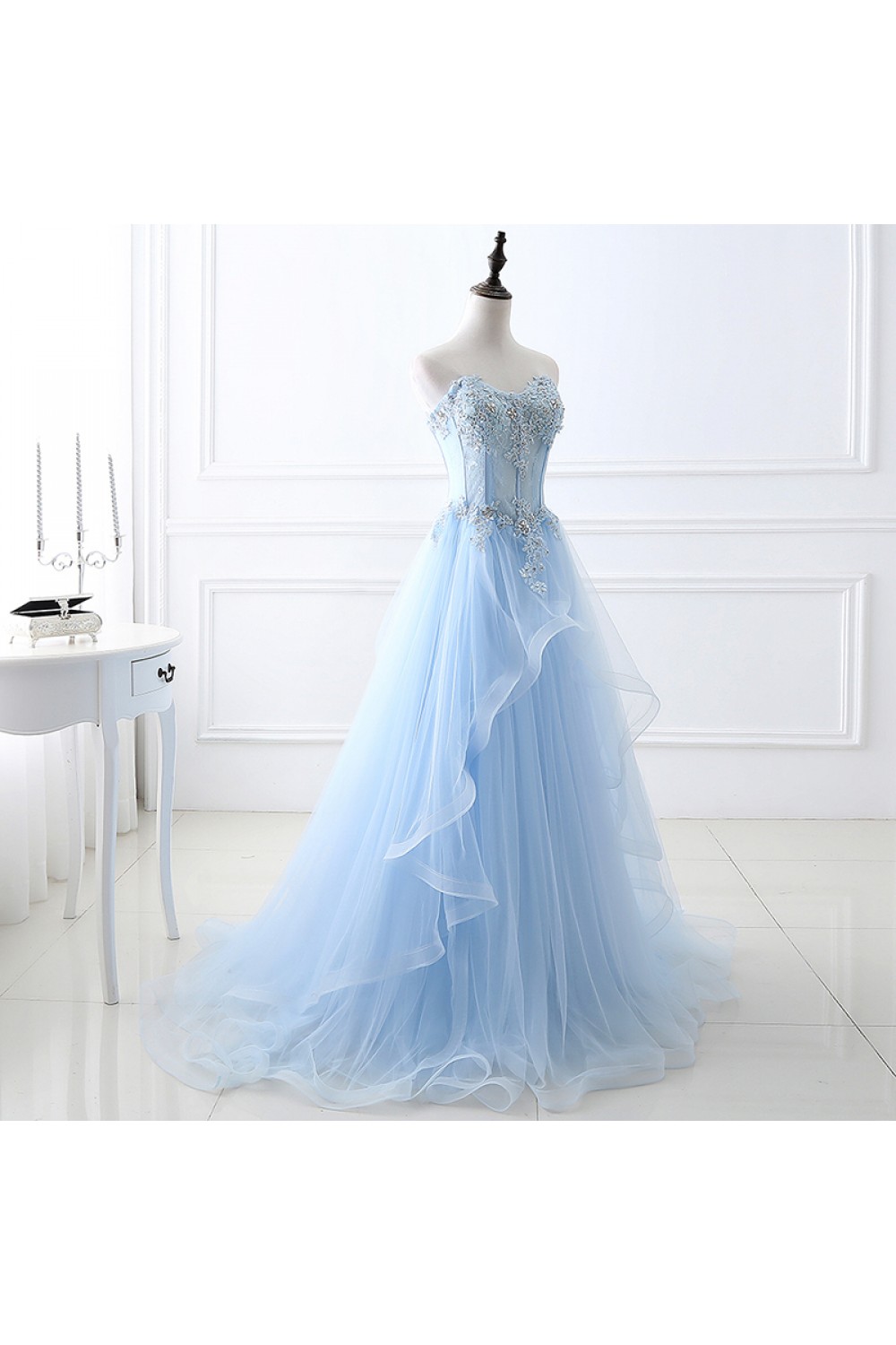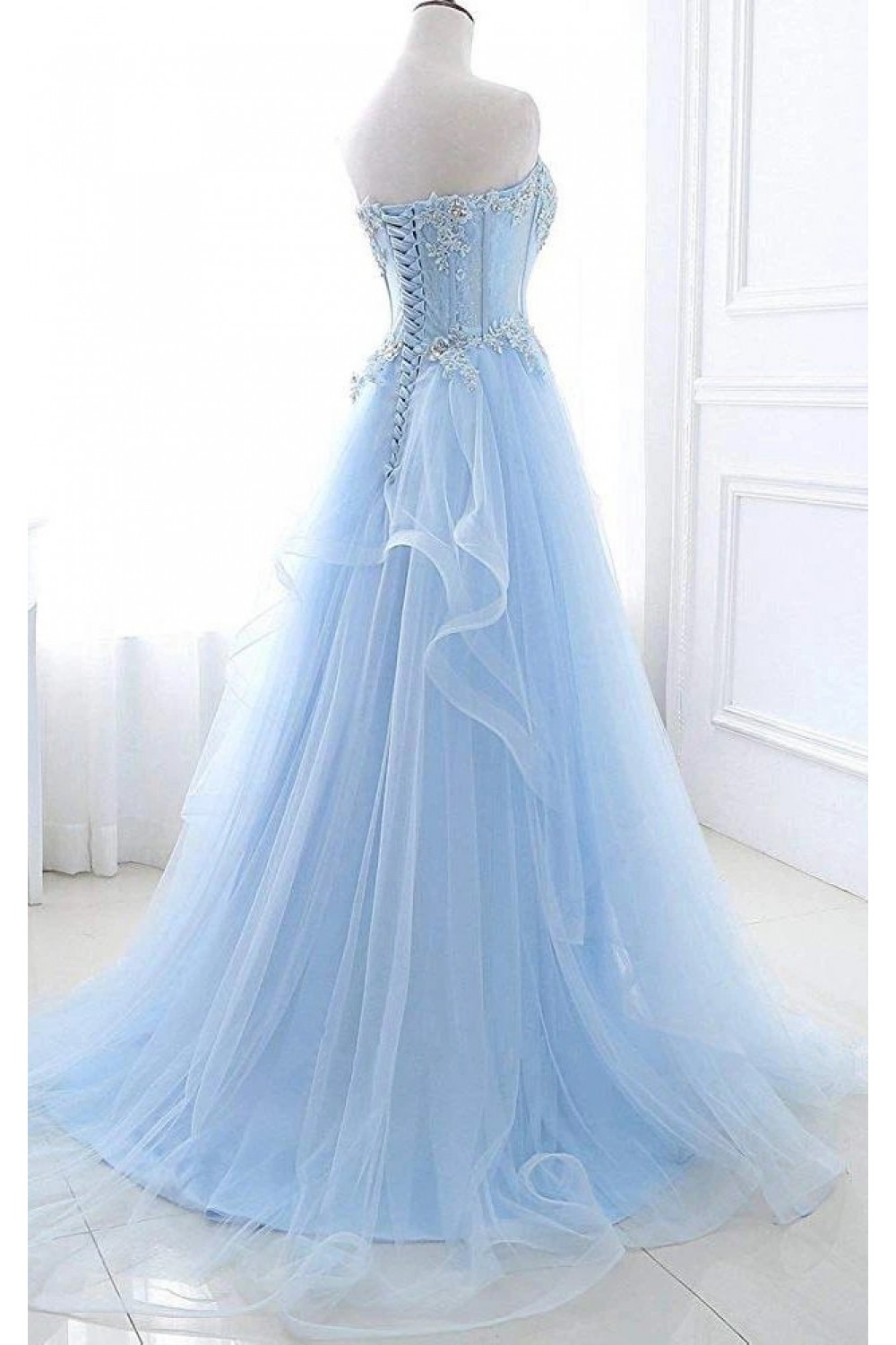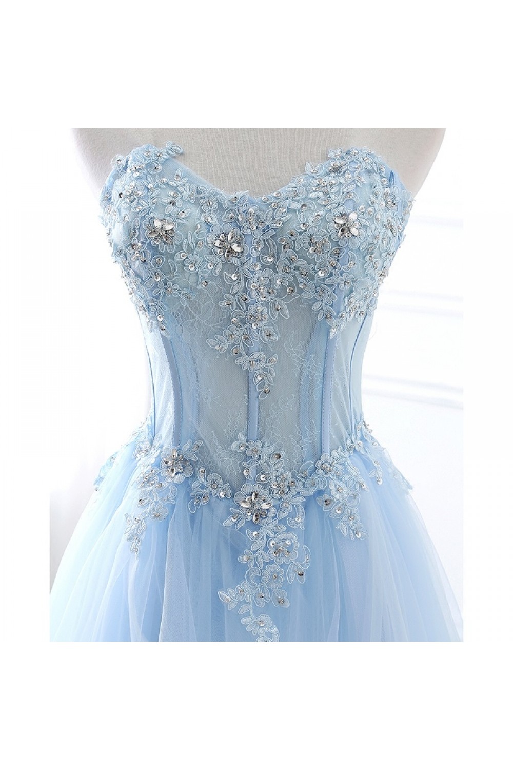 A-Line Long Blue Lace and Tulle Prom Dresses 801592