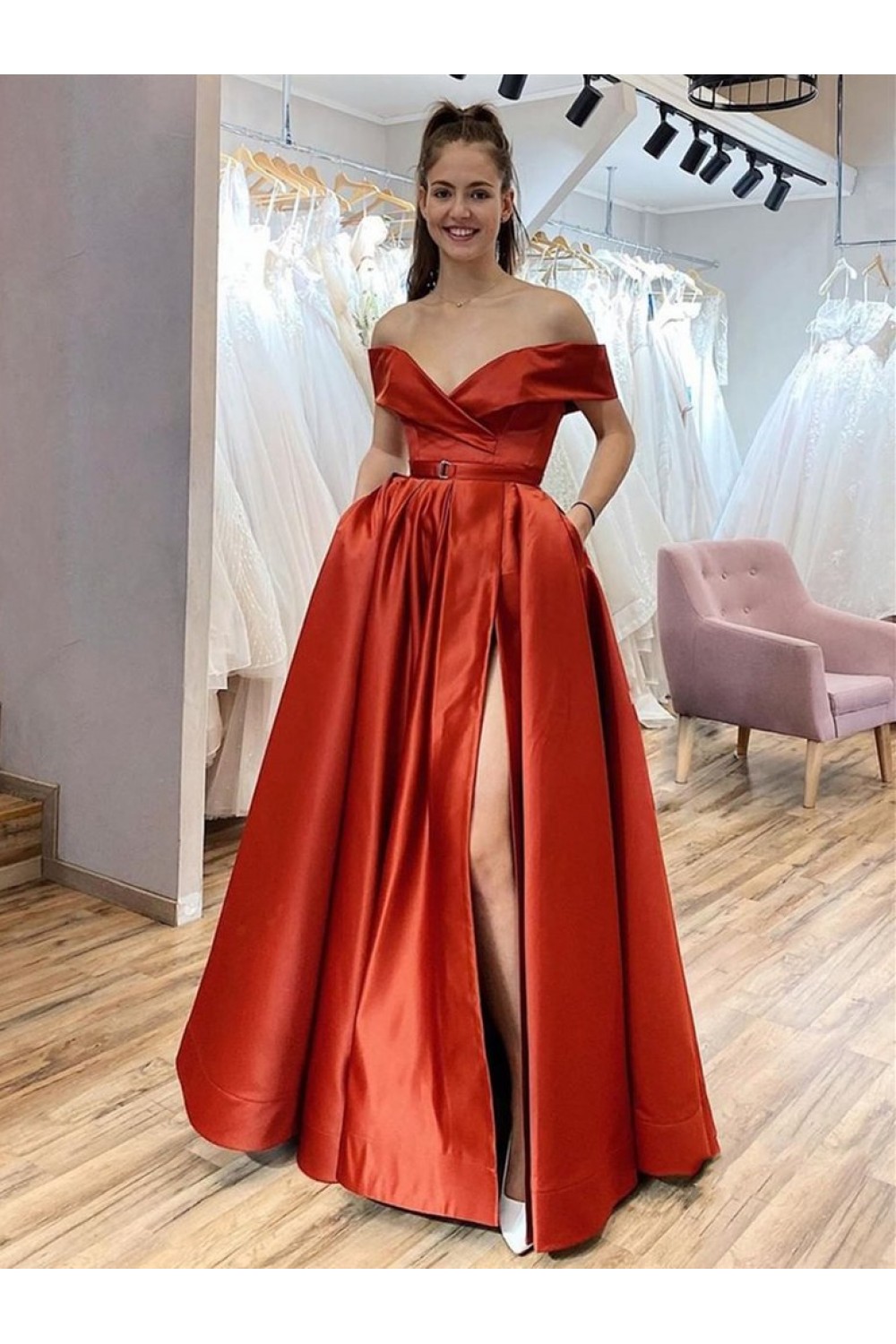 A-Line Long Off the Shoulder Satin Prom Dresses Formal Evening Gowns with Pockets 901069
