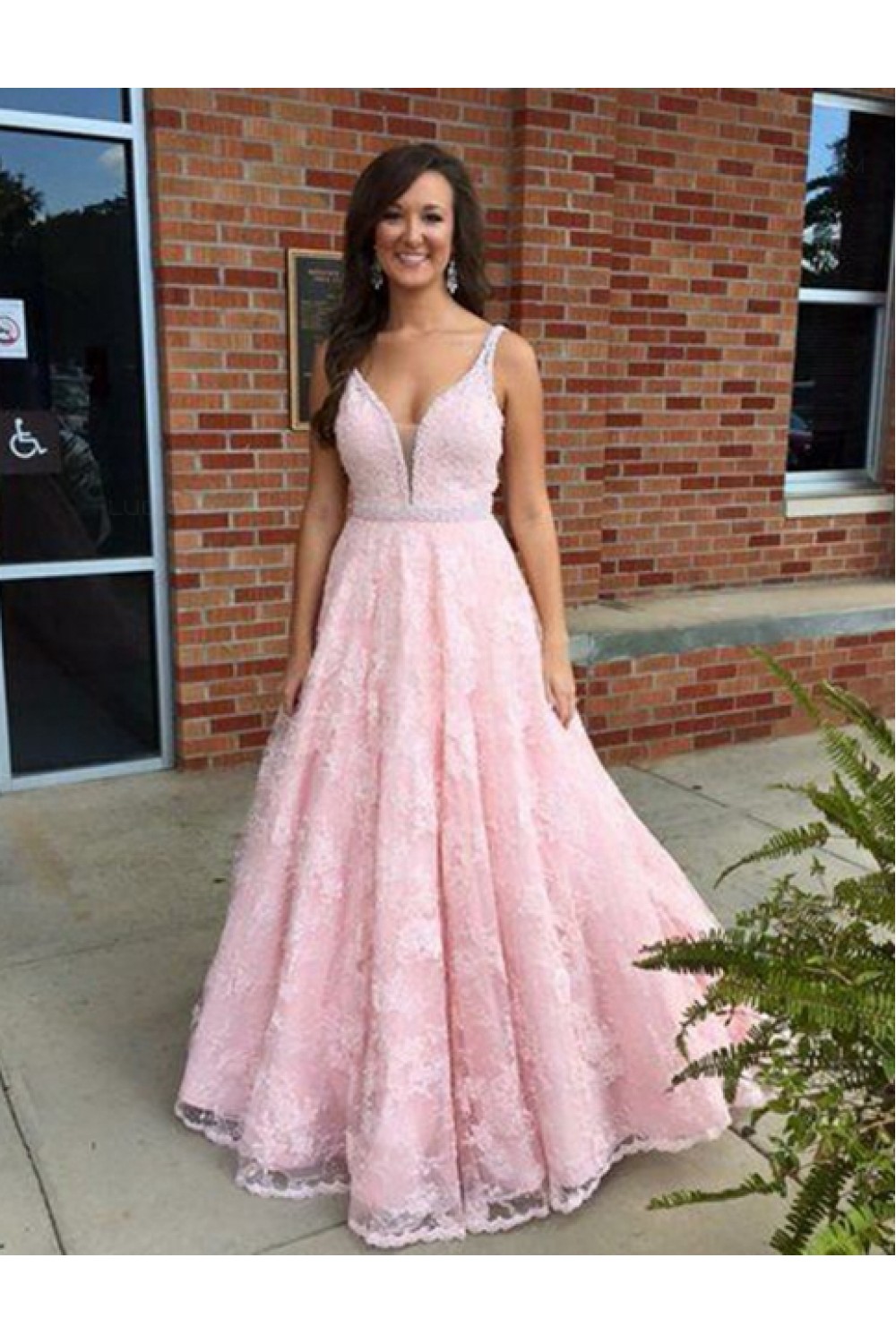 A-Line Long Pink Lace V-Neck Prom Dresses Party Evening Gowns 3020437