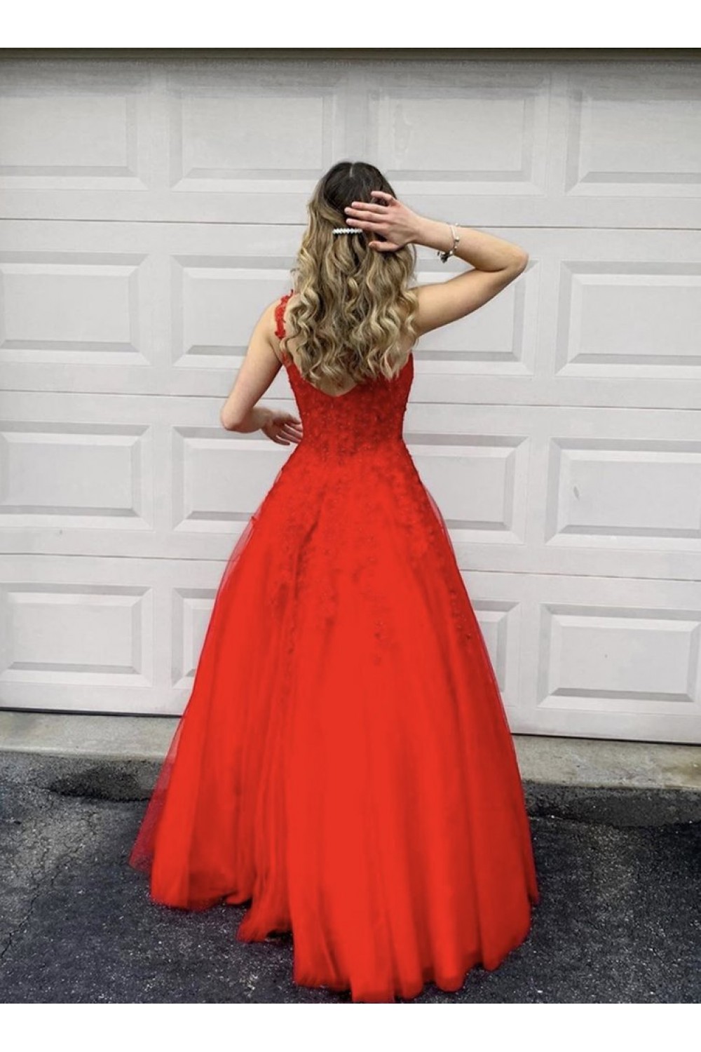 A-Line Long Red Lace and Tulle Beaded Prom Dress Formal Evening Gowns 901143