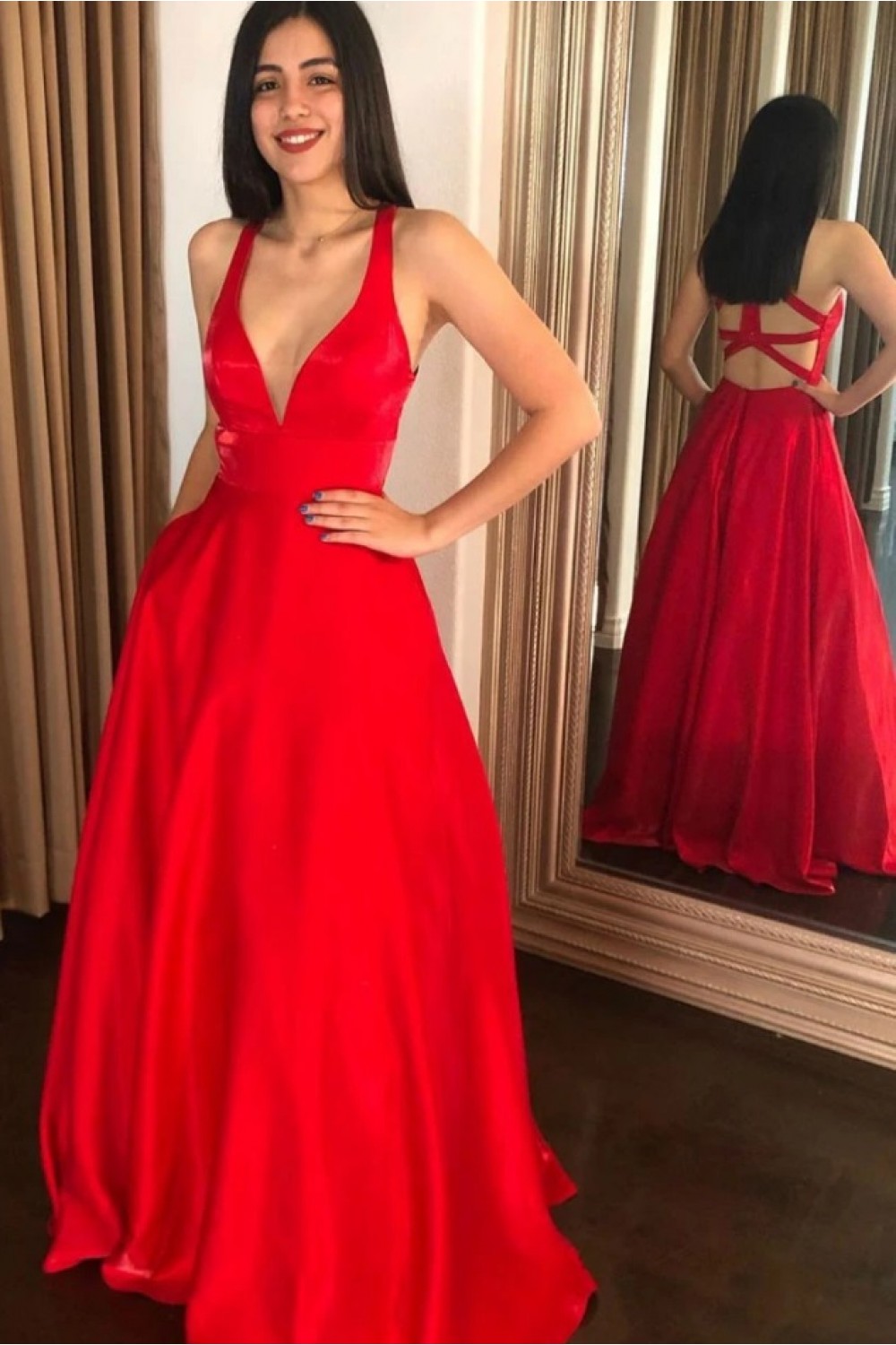 A-Line Long Red V Neck Prom Dress Formal Evening Gowns 901353