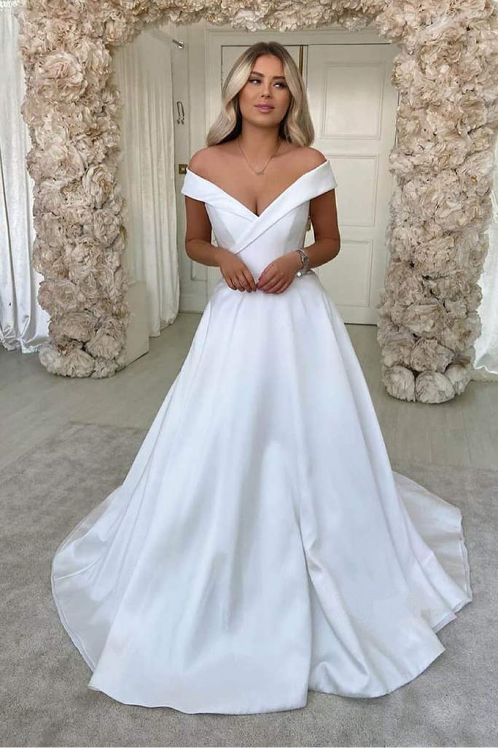 A-Line Long Satin Off the Shoulder Wedding Dresses Bridal Gowns 903265