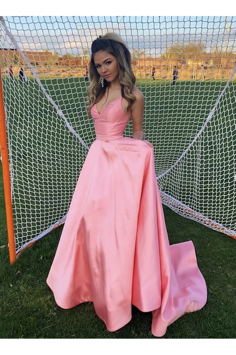 A-Line Long Satin V-Neck Prom Dresses Formal Evening Gowns 6011013