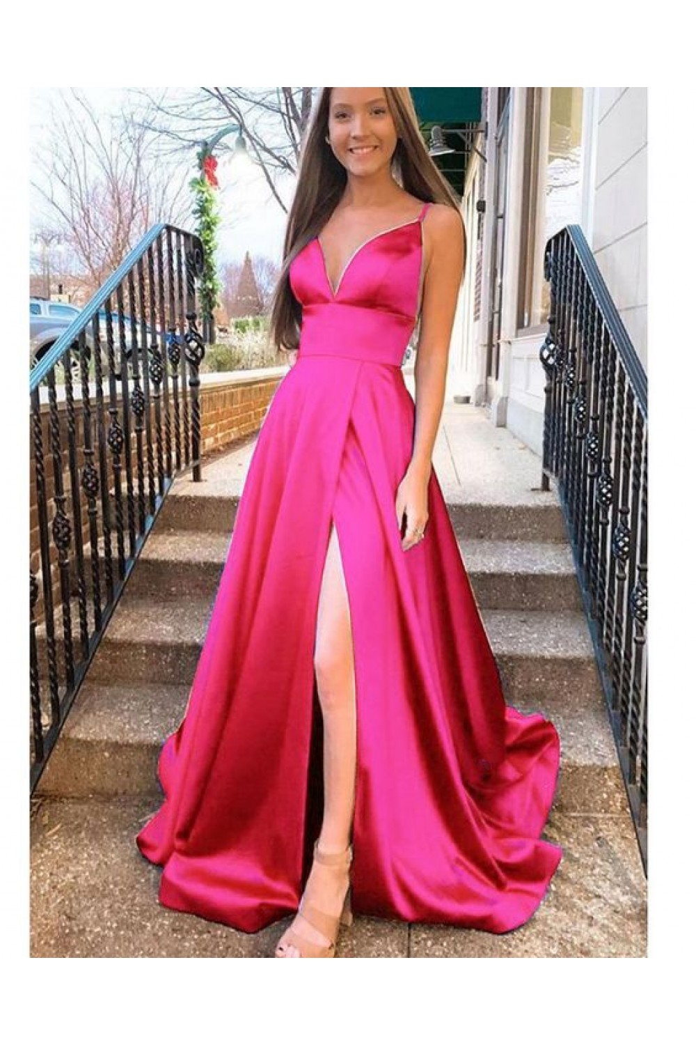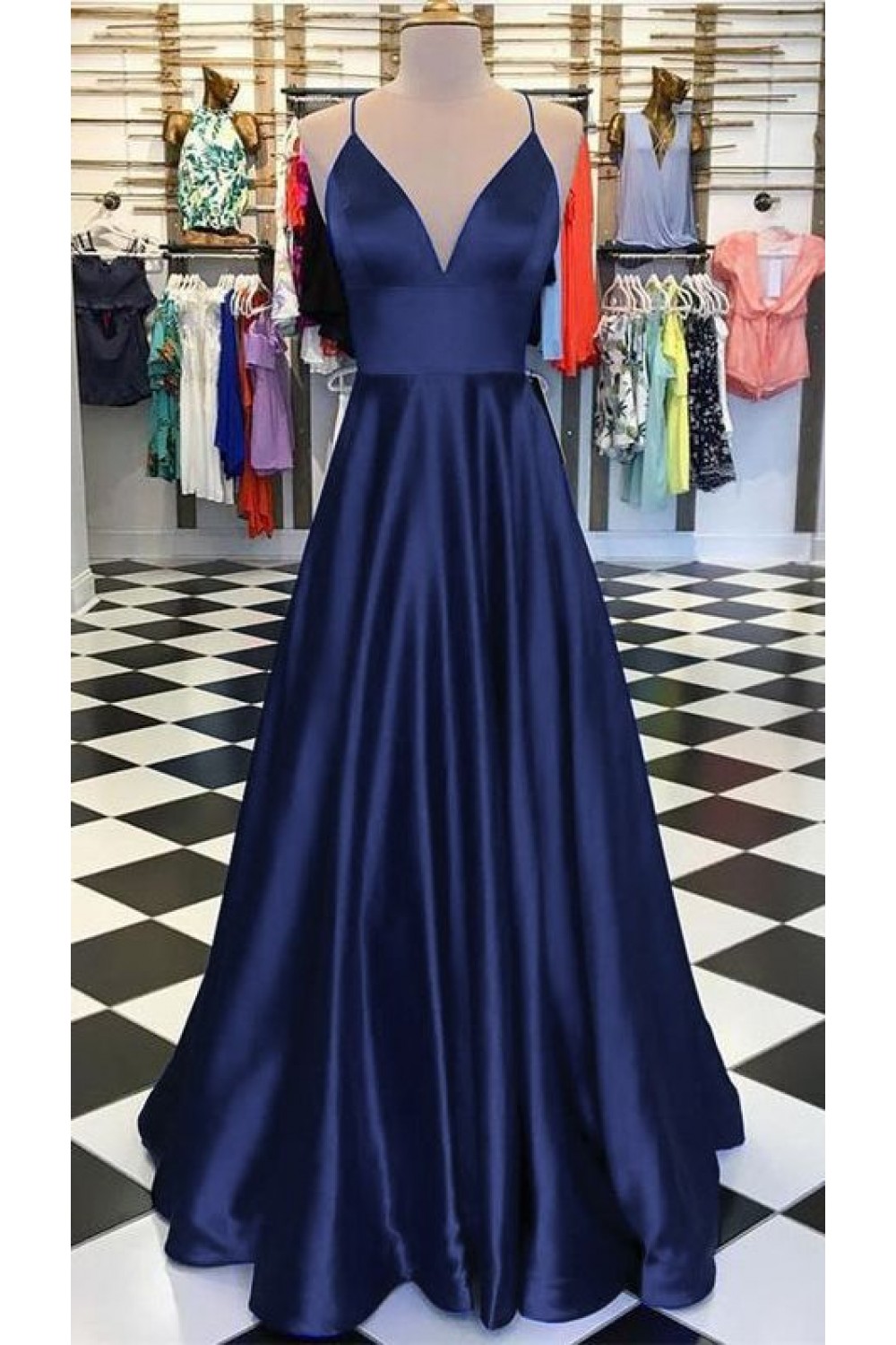 A-Line Long Satin V-Neck Prom Dresses Formal Evening Gowns 6011591