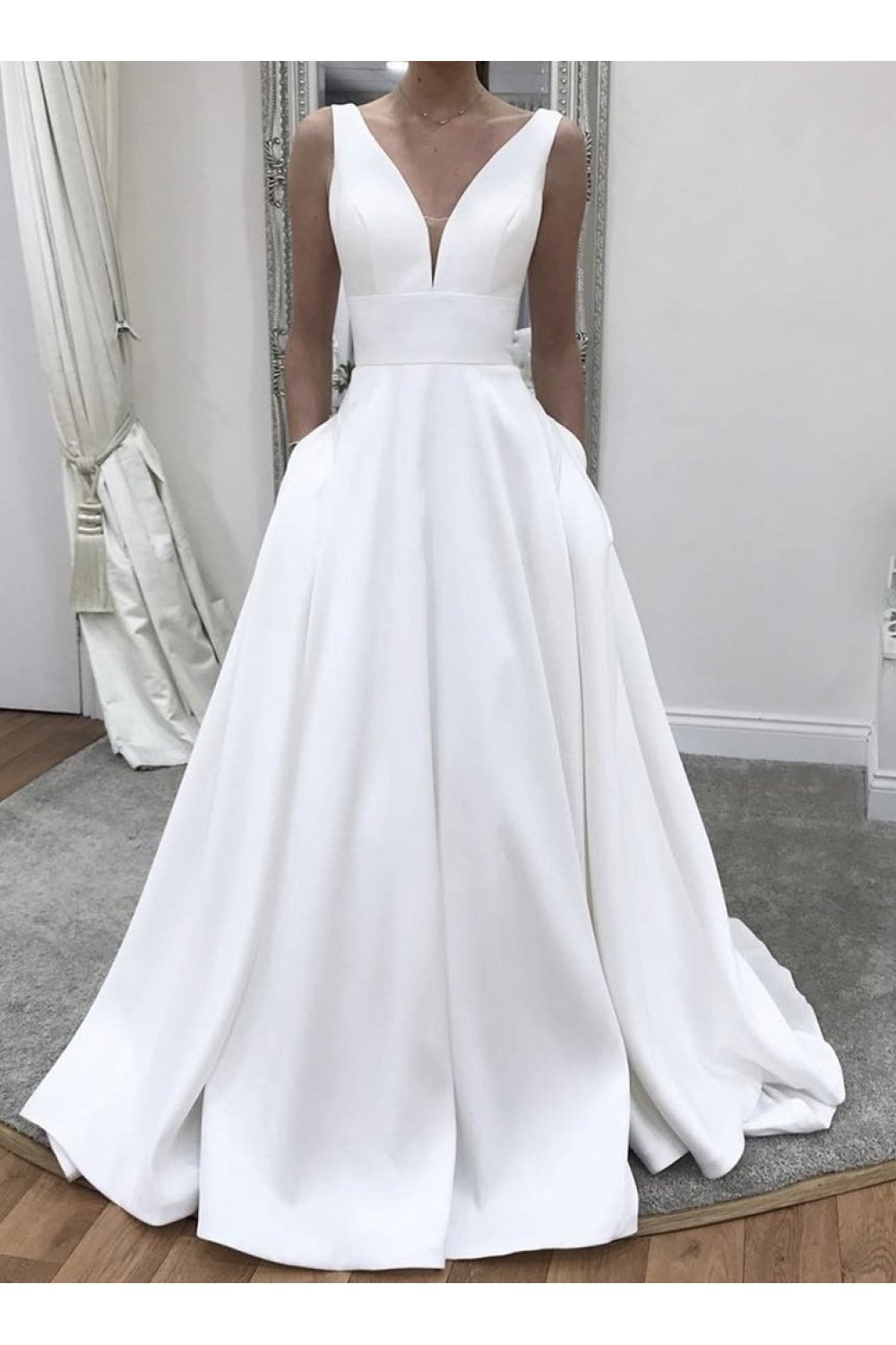 A-Line Long Satin V Neck Wedding Dresses Bridal Gowns 903195