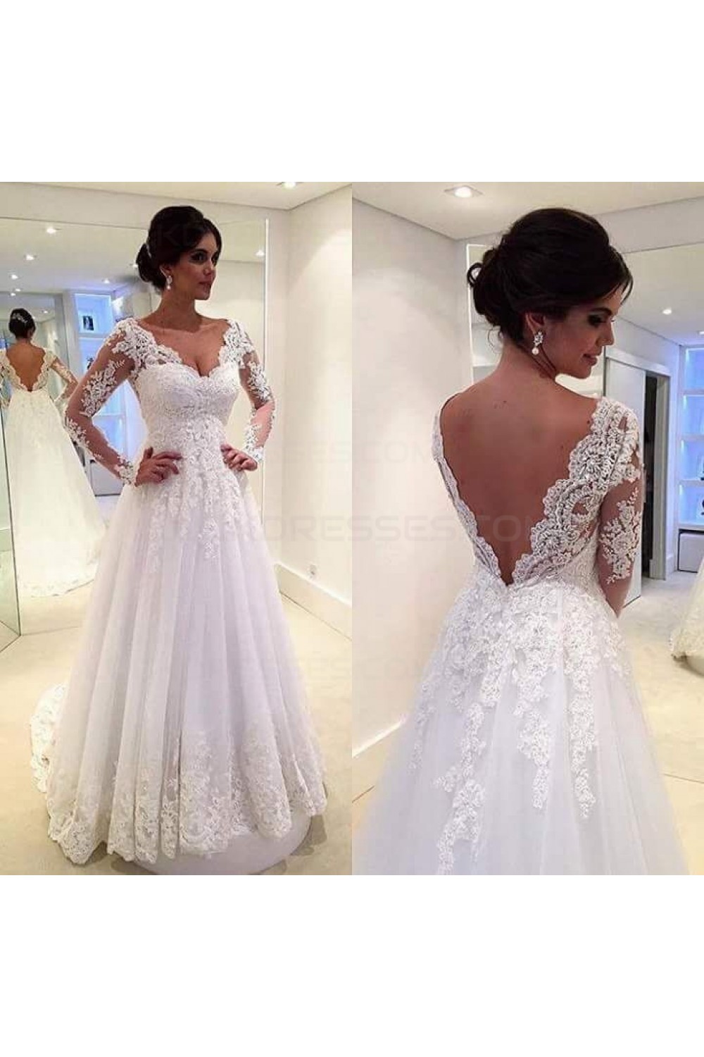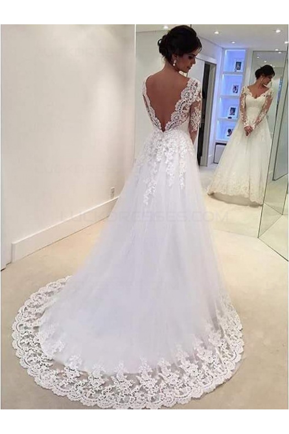 A-Line Long Sleeves Lace V-Neck Wedding Dresses Bridal Gowns 3030095