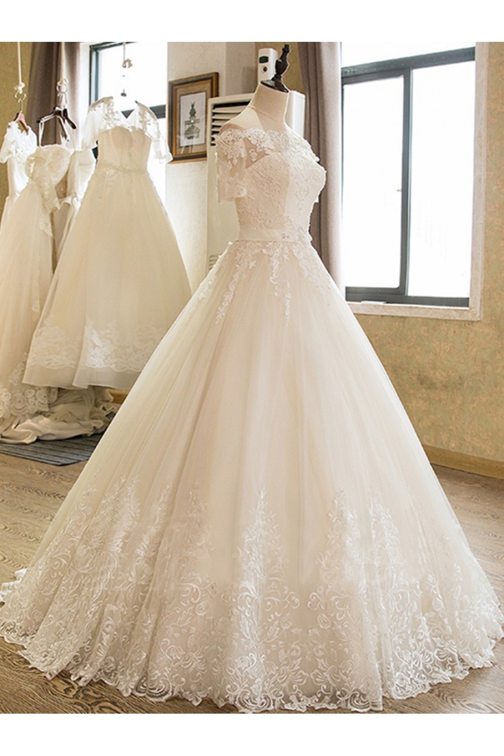 A-Line Off the Shoulder Lace Wedding Dresses Bridal Gowns with Short Sleeves 903040