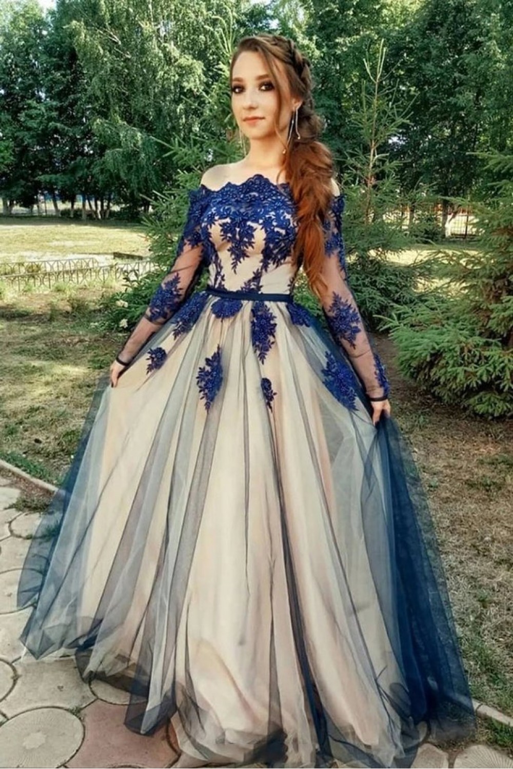 A-Line Off-the-Shoulder Long Sleeves Lace Appliques Long Prom Dress Formal Evening Dresses 601447