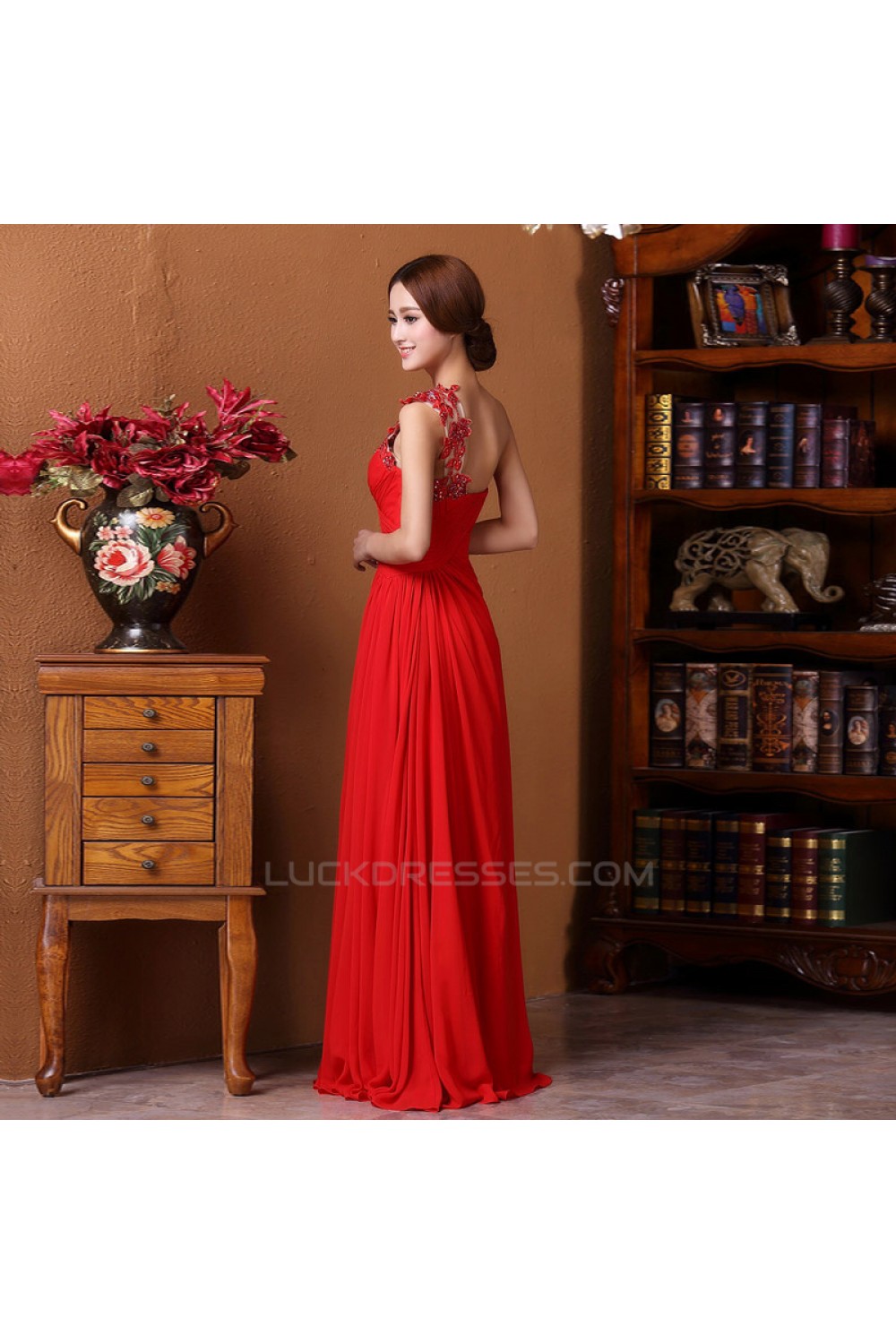 A-Line One-Shoulder Beaded Applique Long Red Chiffon Prom Evening Formal Dresses ED011315