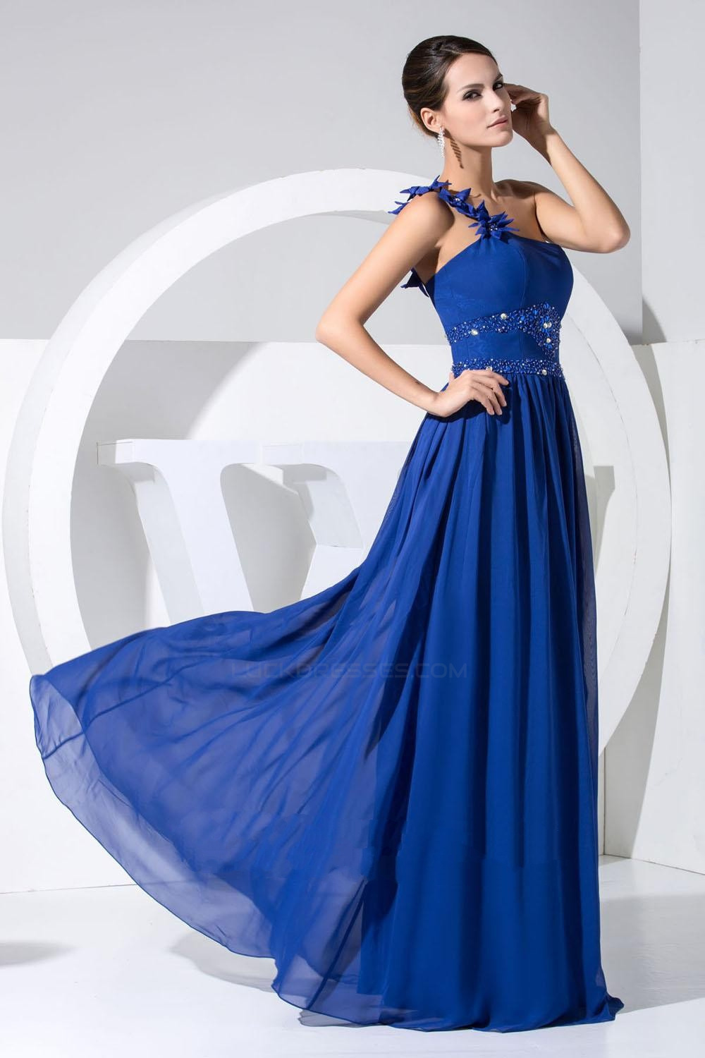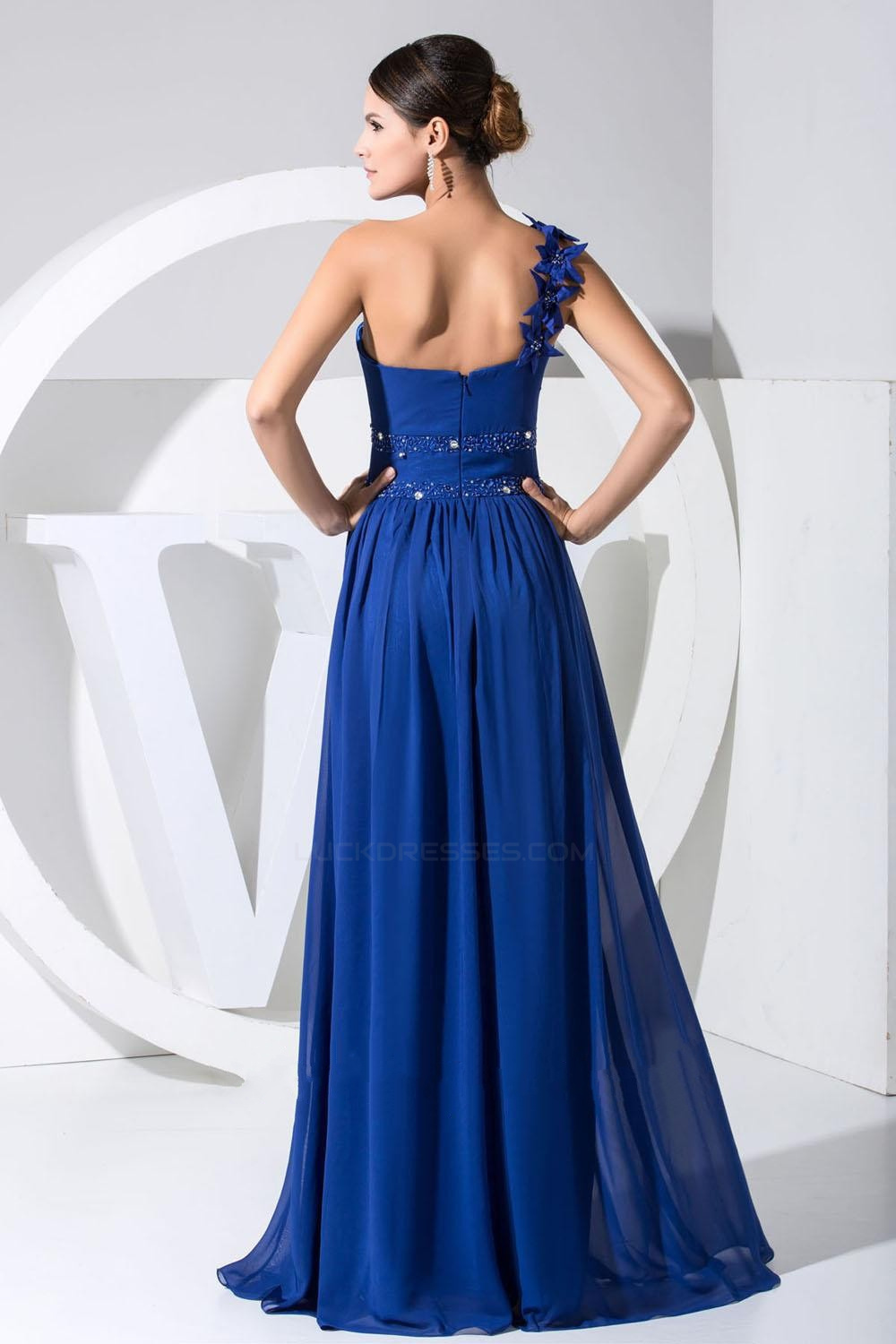 A-Line One-Shoulder Beaded Long Blue Chiffon Prom Evening Dresses ED010837