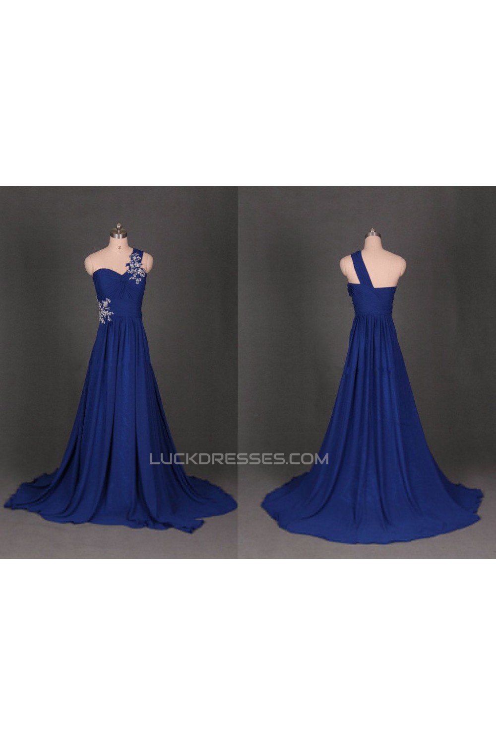 A-Line One-Shoulder Beaded Long Blue Chiffon Prom Evening Formal Dresses ED011119