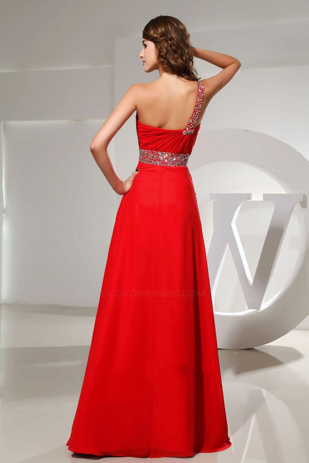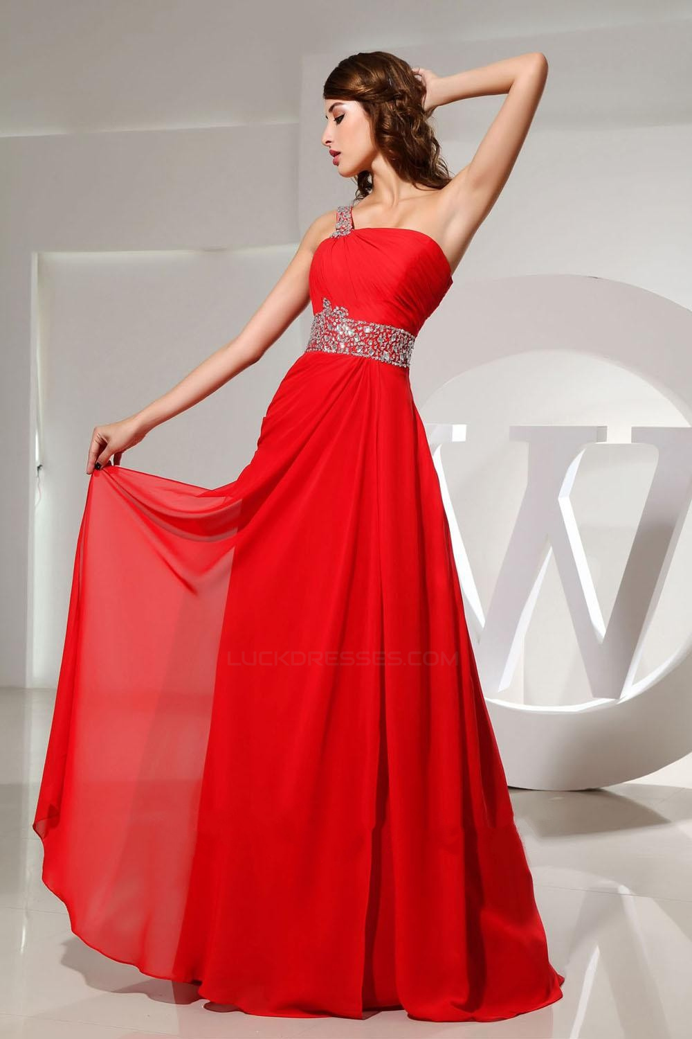 A-Line One-Shoulder Beaded Long Red Chiffon Prom Evening Dresses ED010831