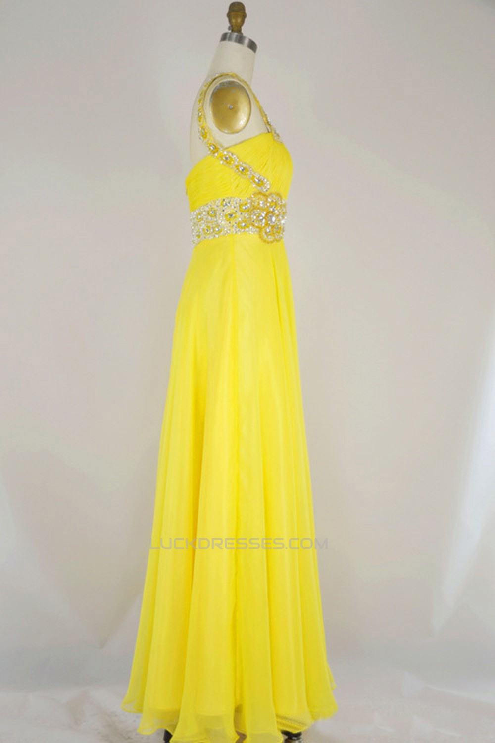 A-Line One-Shoulder Beaded Long Yellow Chiffon Prom Evening Formal Dresses ED011165