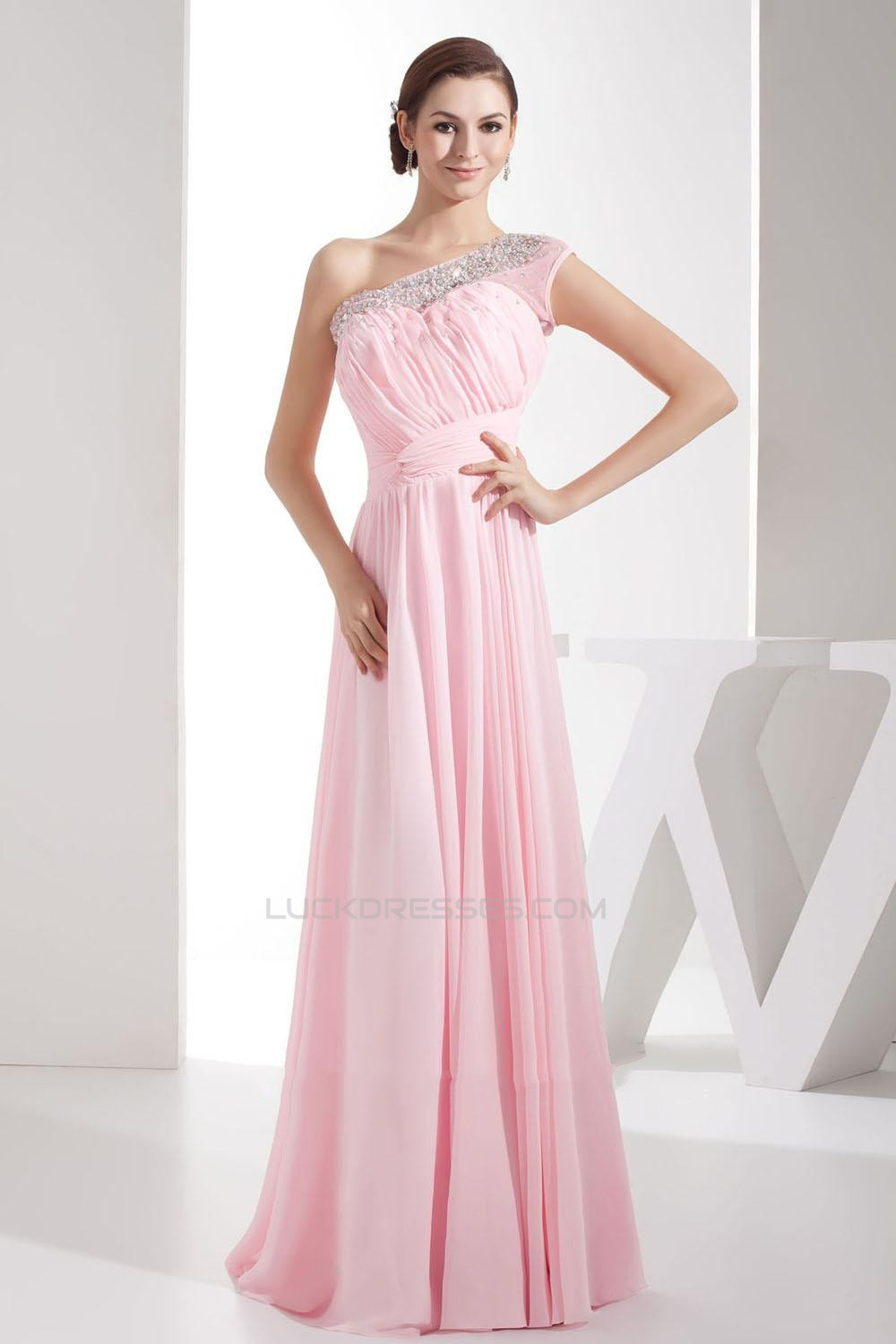 -60% A-Line One-Shoulder Beaded Pink Long Chiffon Prom Evening Formal Dresses ED010936