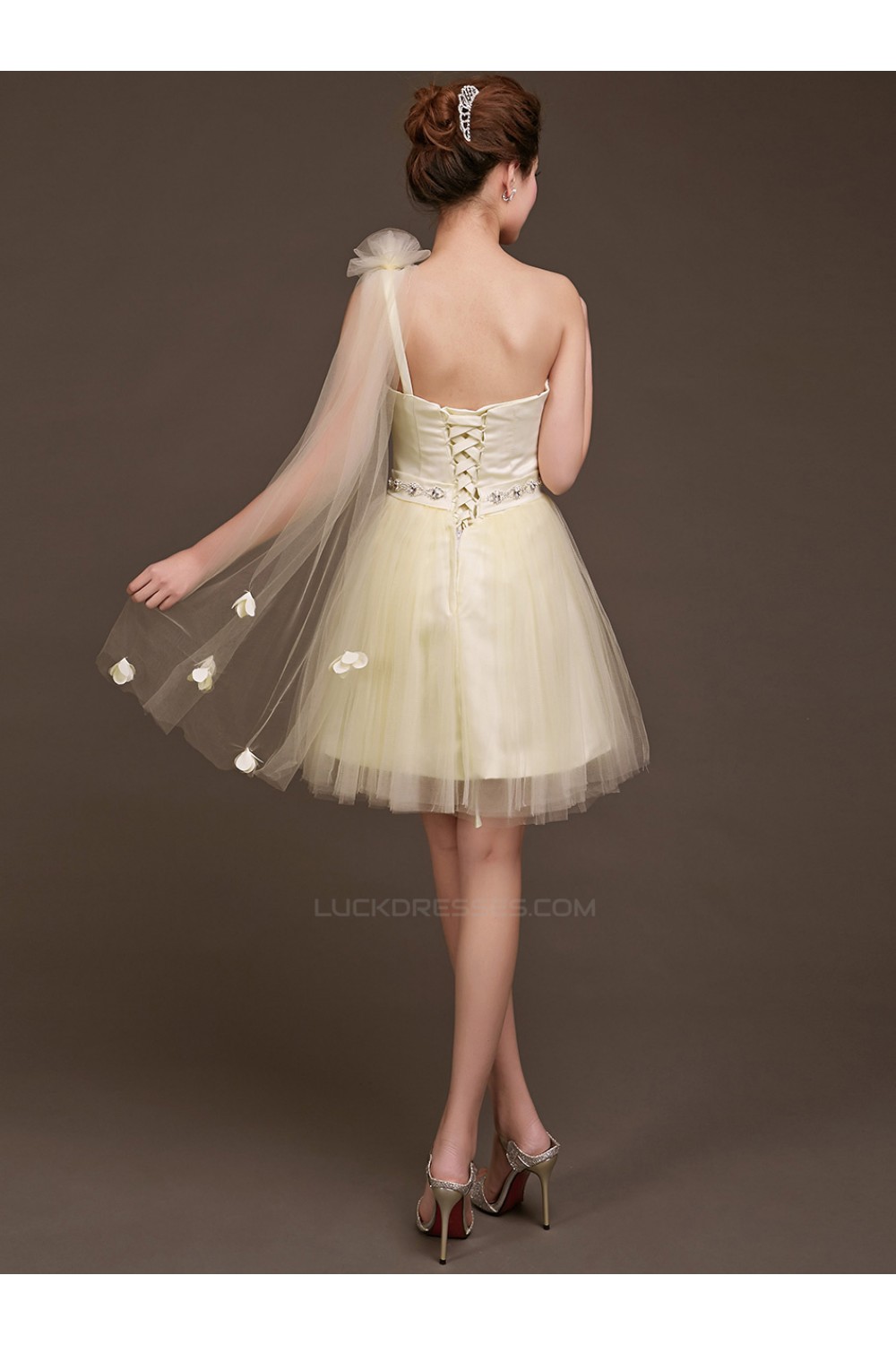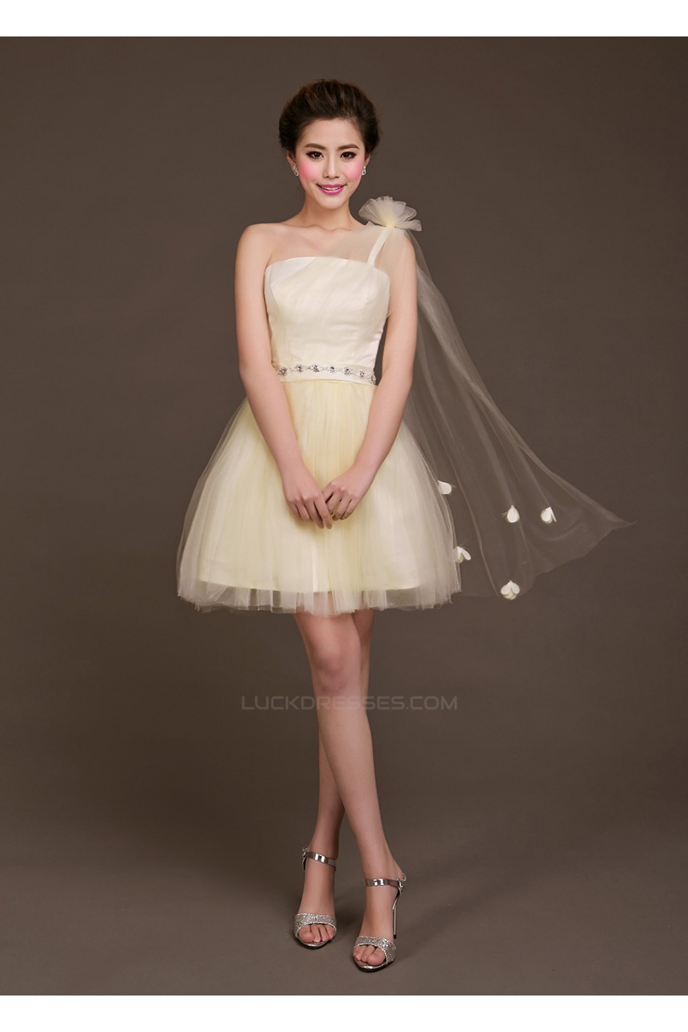 A-Line One-Shoulder Beaded Tulle Short Bridesmaid Dresses/Evening Dresses BD010617