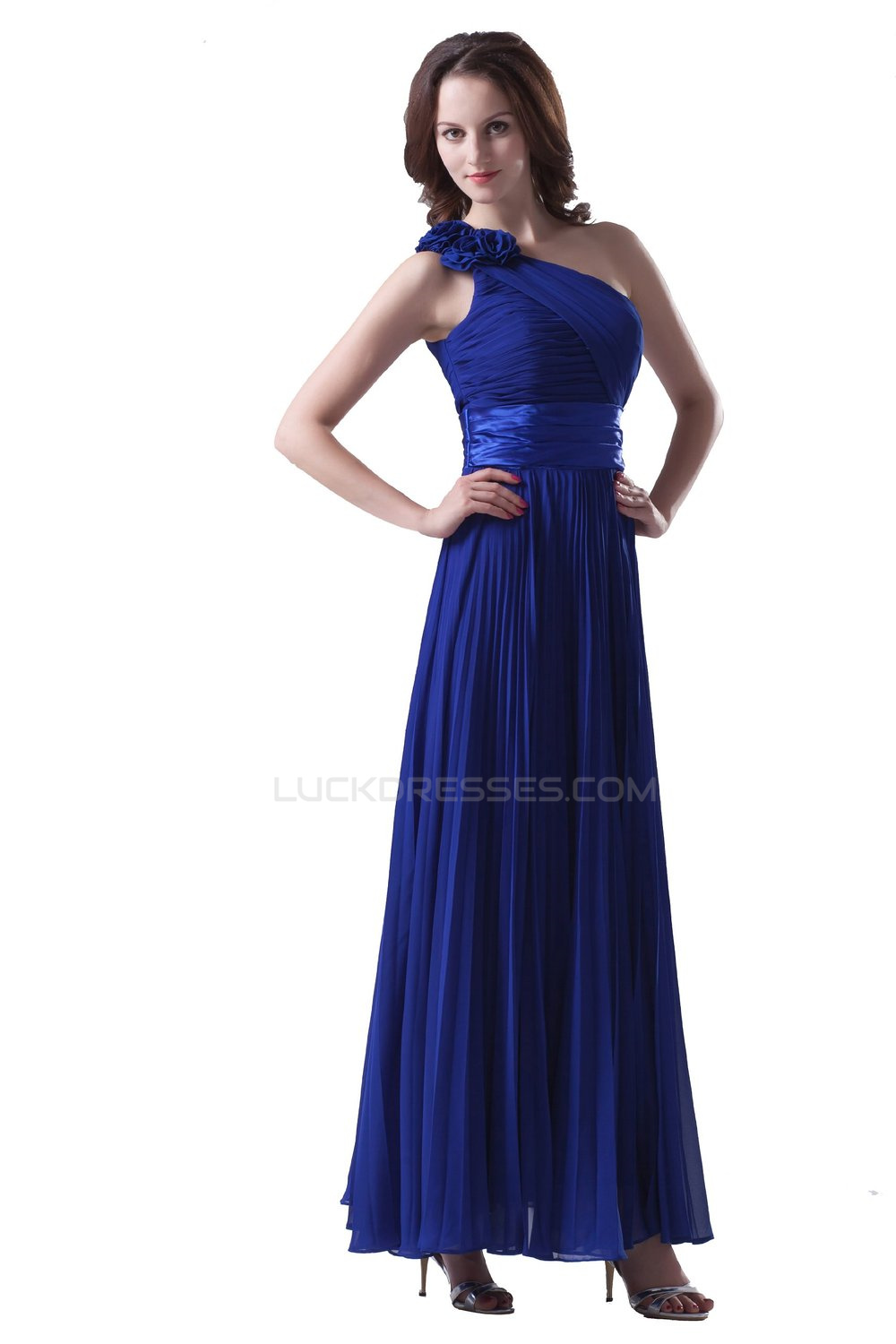 A-Line One-Shoulder Pleated Long Blue Chiffon Prom Evening Formal Party Dresses ED010274
