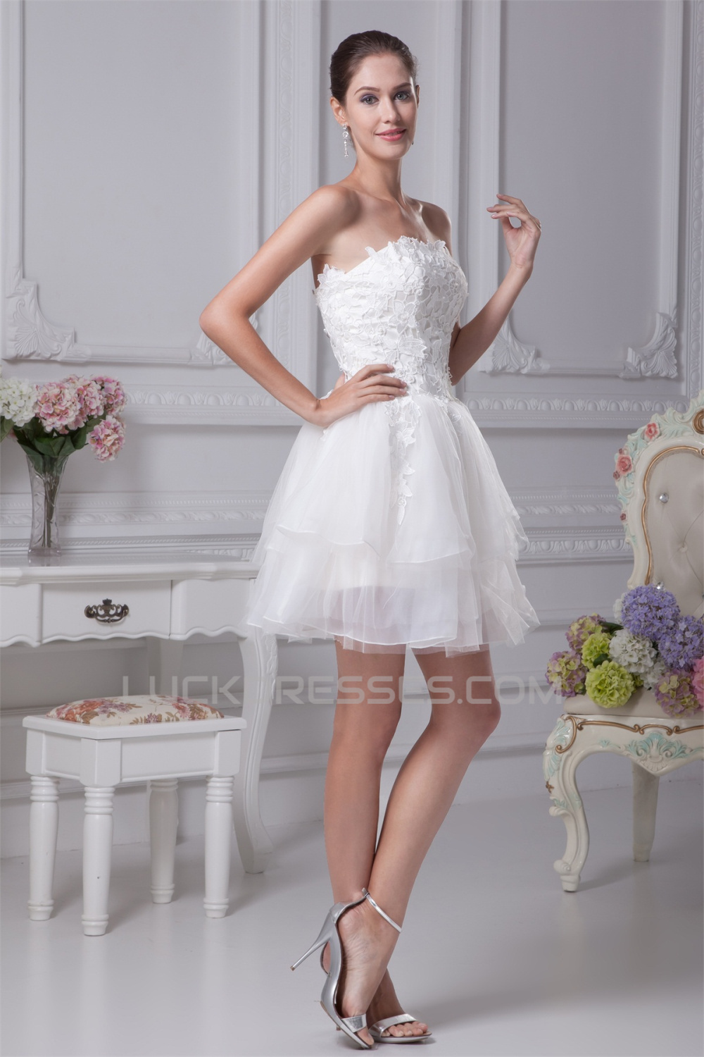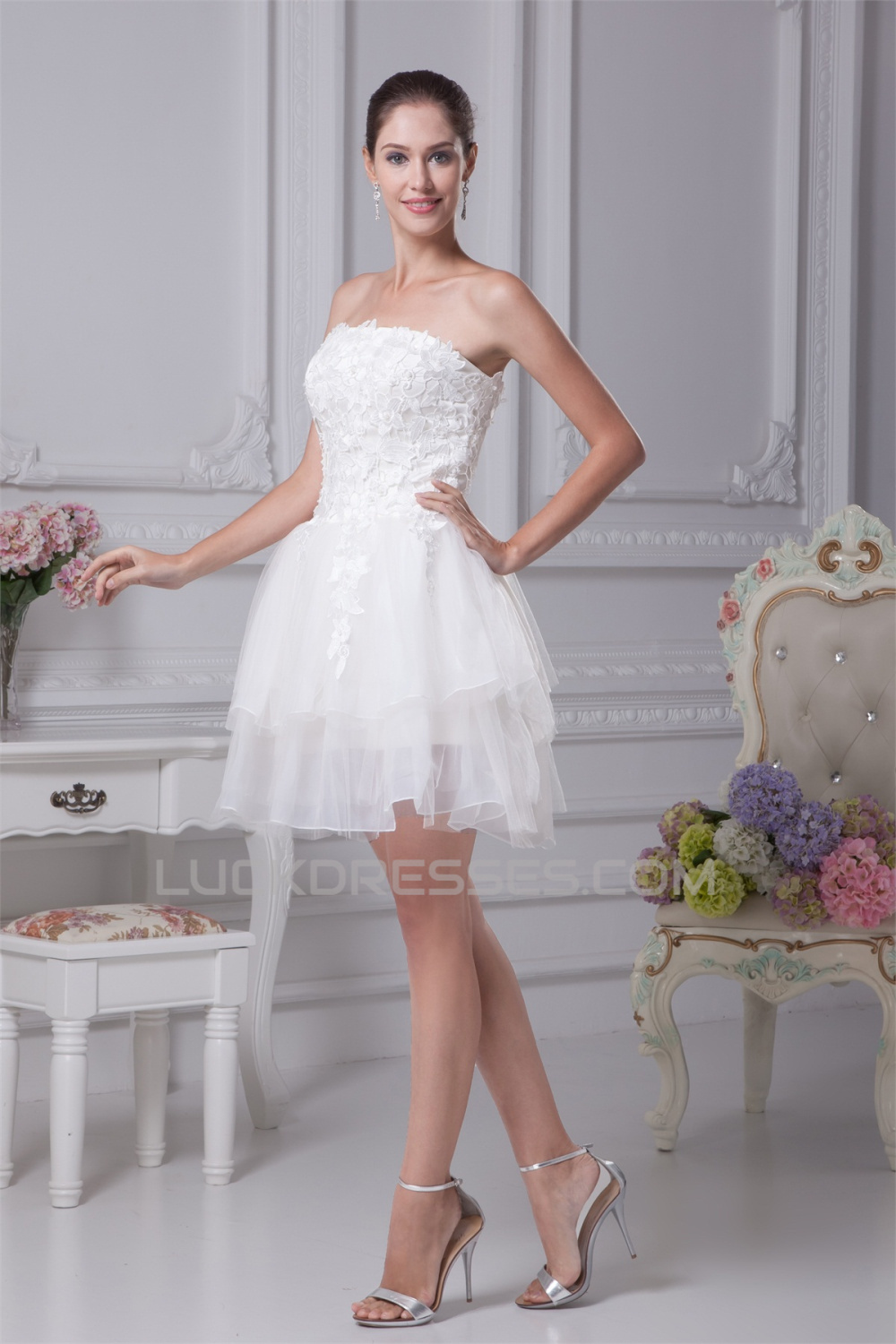A-Line Satin Fine Netting Strapless Lace Short Reception Wedding Dresses 2031507