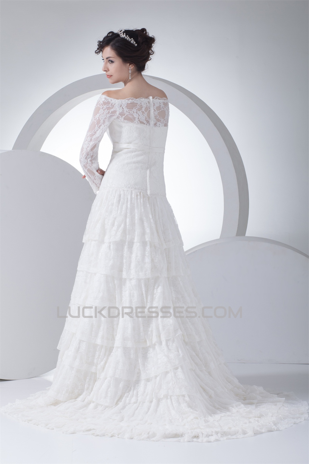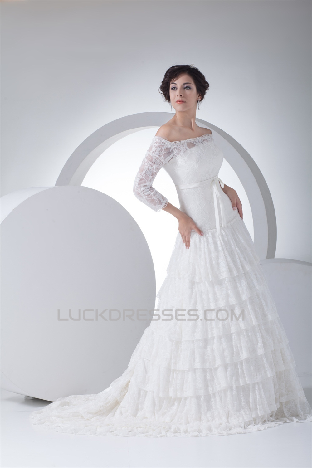 A-Line Satin Lace Fine Netting Off-the-Shoulder Wedding Dresses 2030236