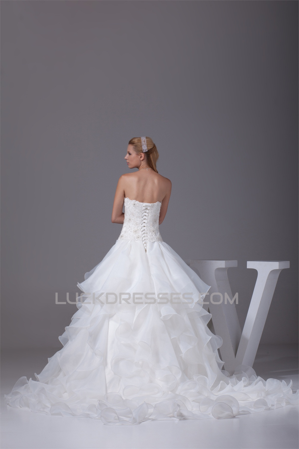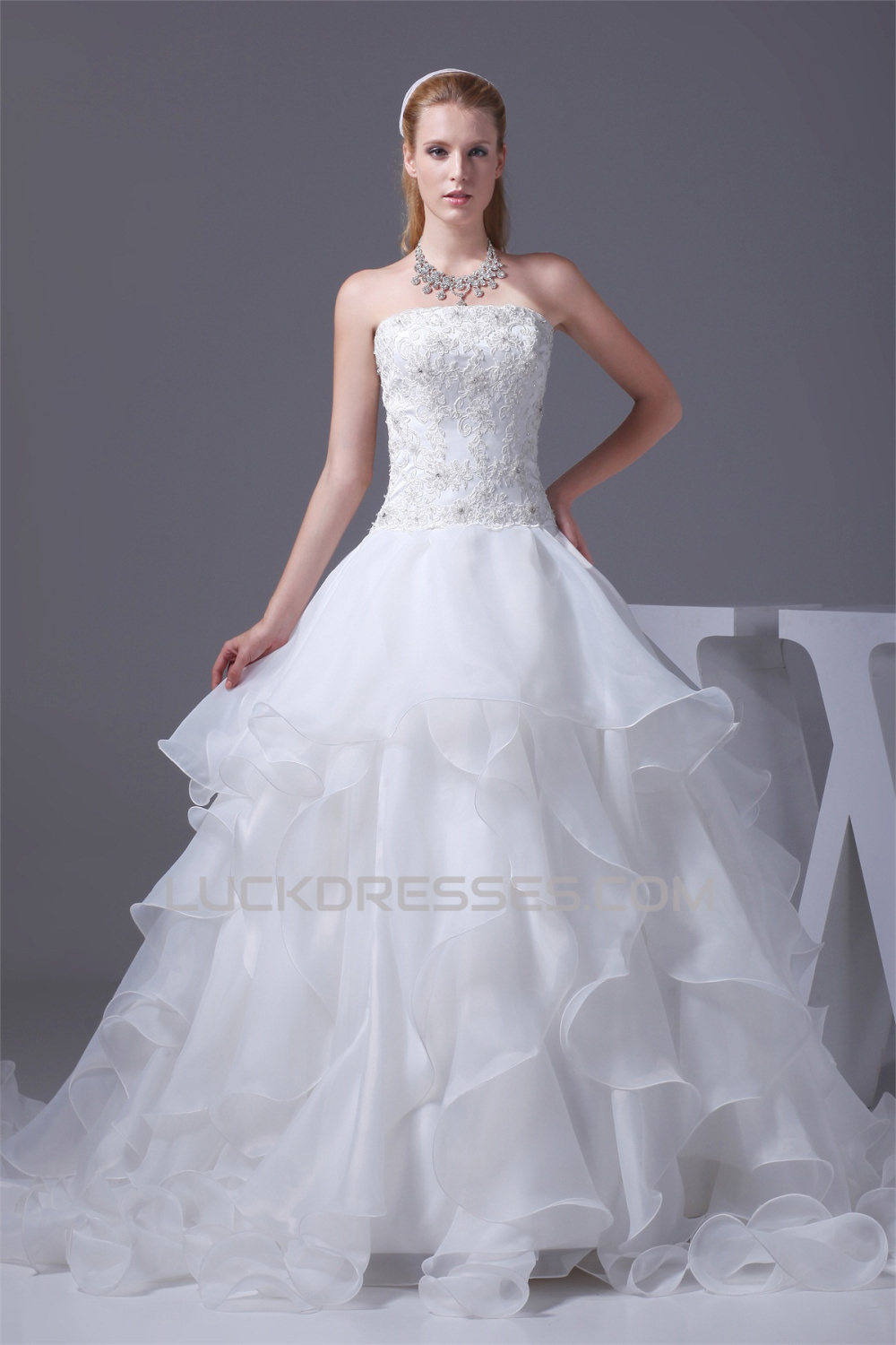-50% A-Line Satin Organza Lace Sleeveless Strapless Chapel Train Wedding Dresses 2030350