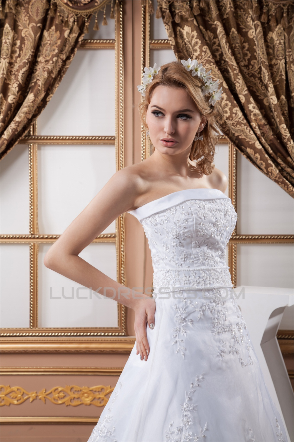 -50% A-Line Satin Organza Strapless Beaded Lace Wedding Dresses 2030907