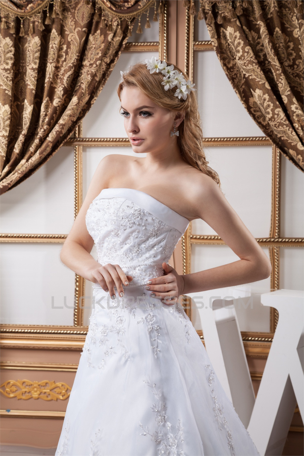 A-Line Satin Organza Strapless Beaded Lace Wedding Dresses 2030907