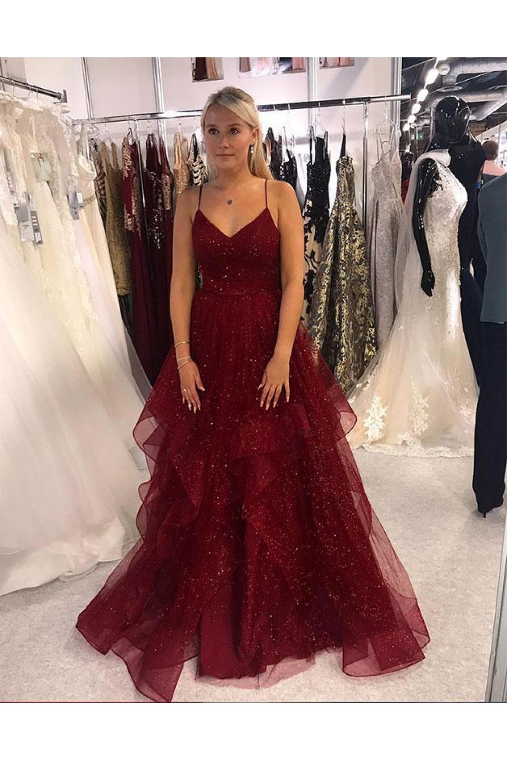 -56% A-Line Sequins Tulle V-Neck Long Prom Dresses Formal Evening Gowns 6011366
