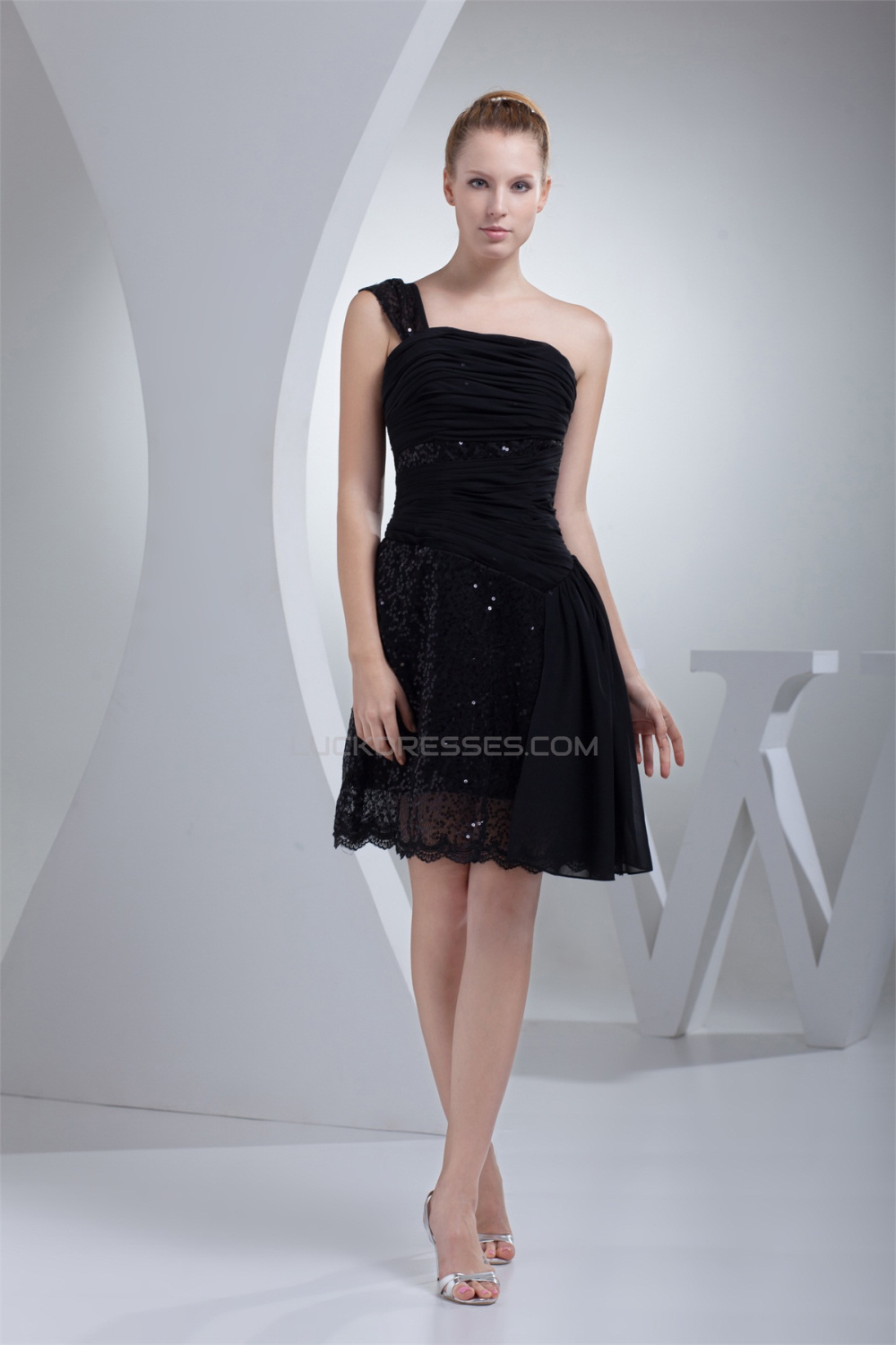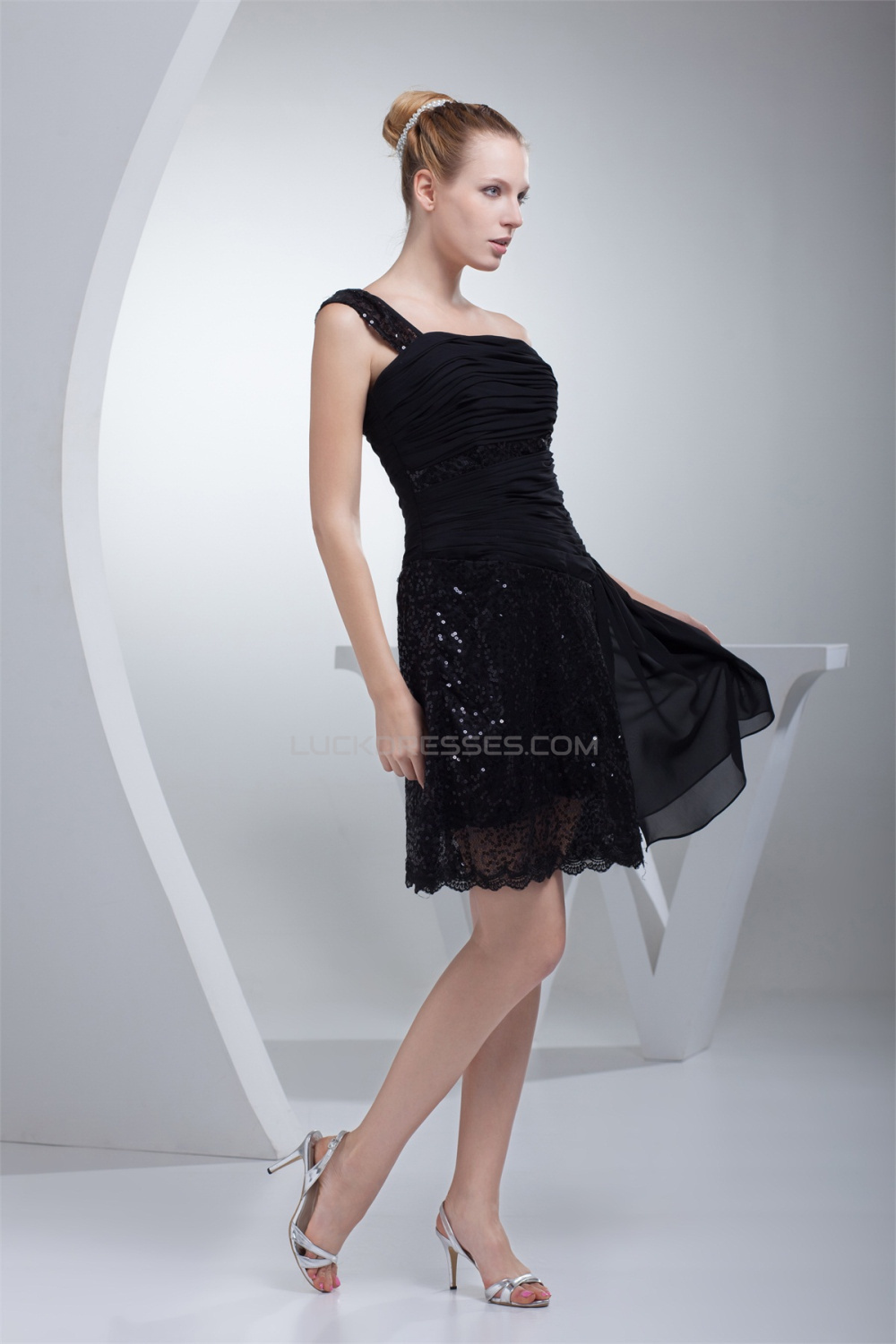 A-Line Short/Mini One-Shoulder Sleeveless Sequins Black Dresses 02021097