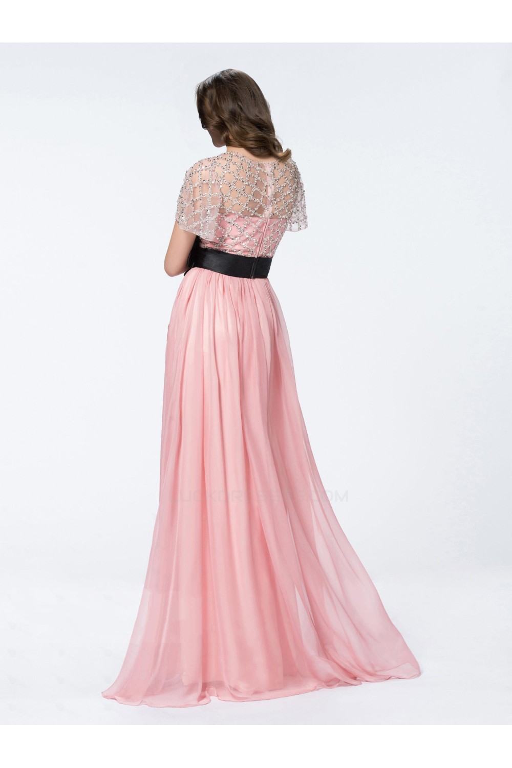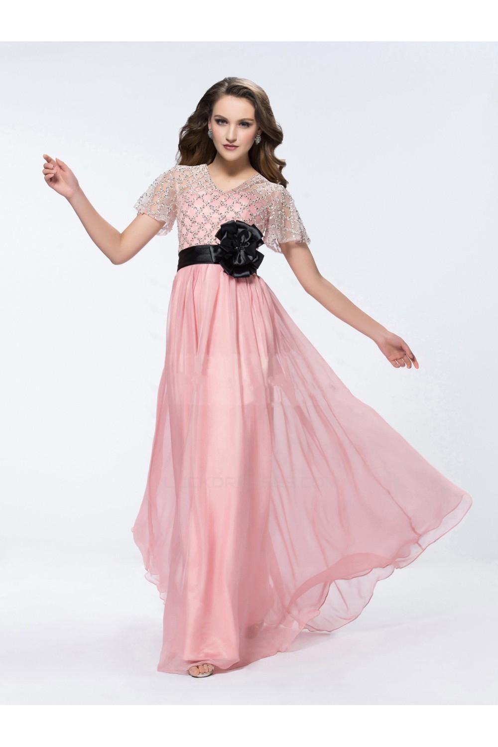 A-Line Short Sleeve Beaded Long Pink Prom Evening Formal Party Dresses ED010584