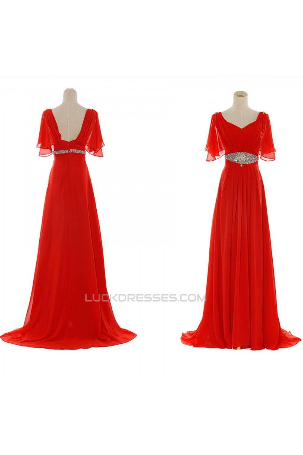 A-Line Short Sleeve Beaded Long Red Chiffon Prom Evening Formal Dresses ED011041