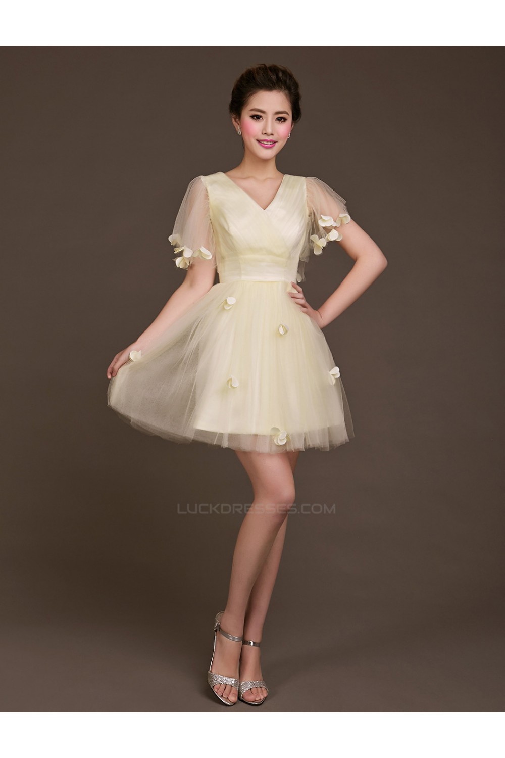 A-Line Short Sleeve V-Neck Tulle Bridesmaid Dresses/Evening Dresses BD010616