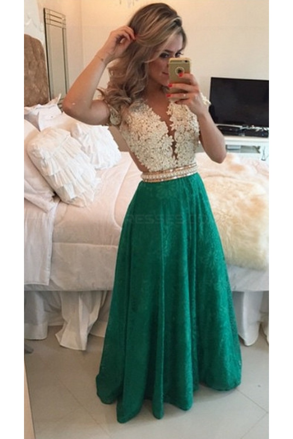 A-Line Short Sleeves Lace Chiffon Royal Blue White Long Prom Dresses Evening Gowns 3020206